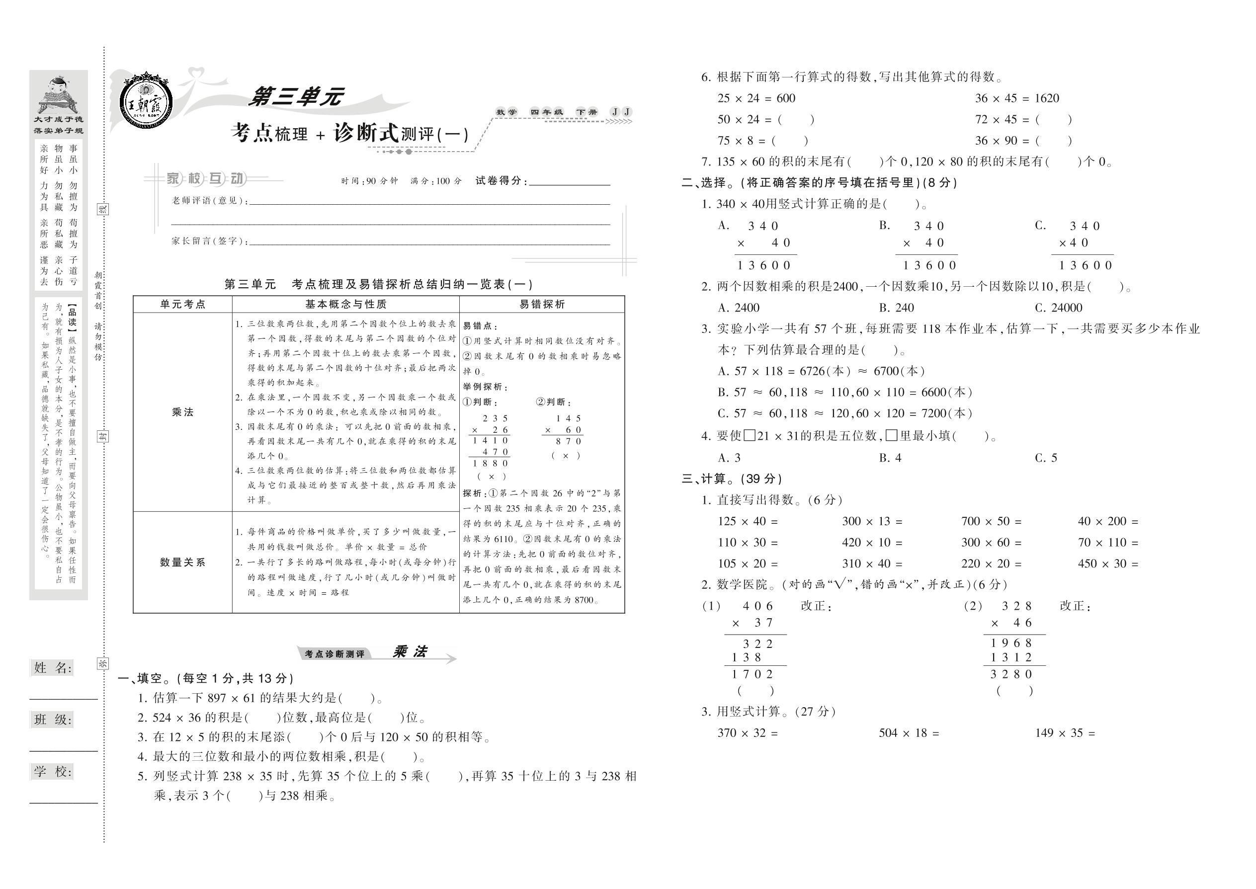 2021下册四年级数学冀教版 第三单元 考点梳理+诊断式测评(一)