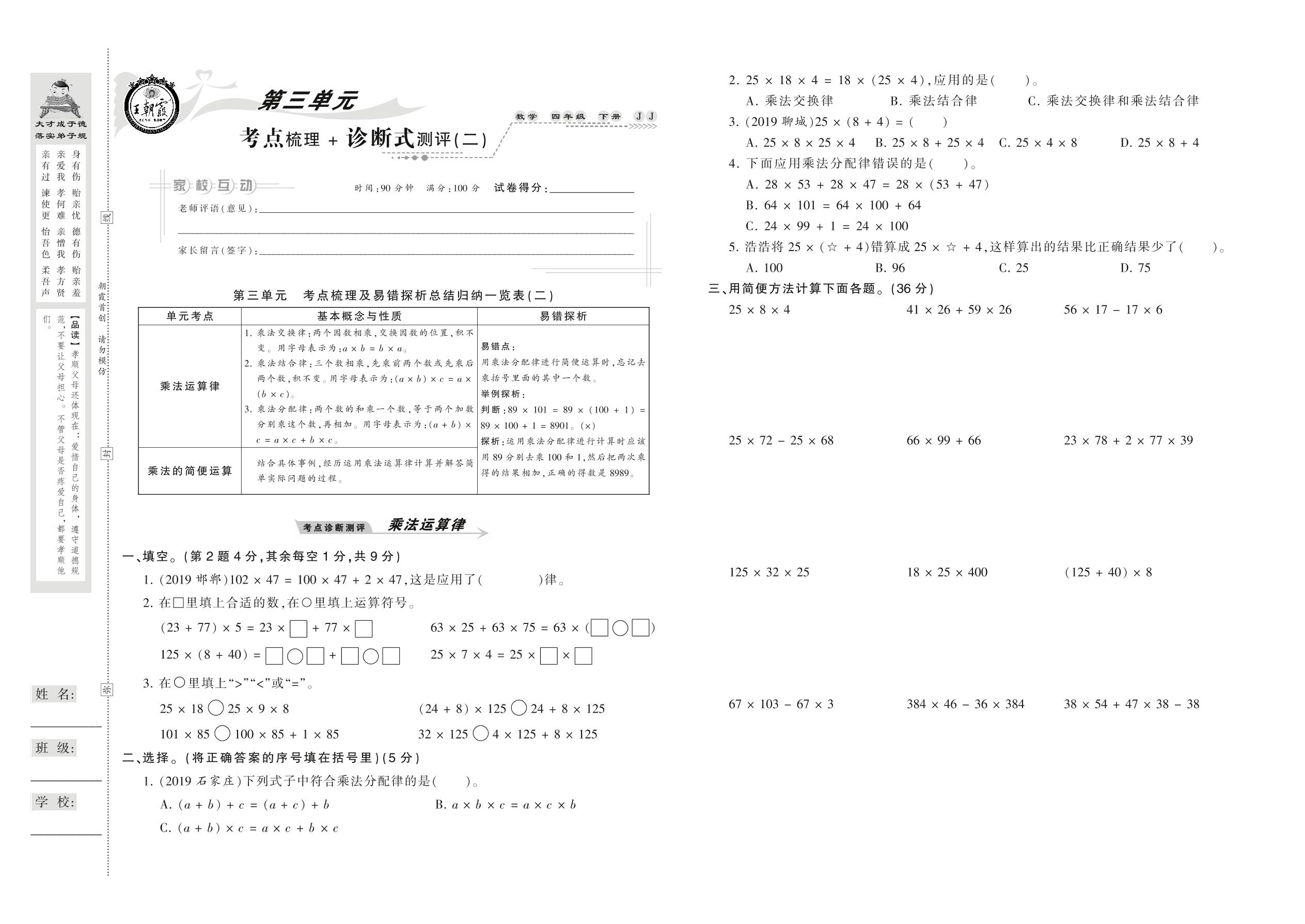2021下册四年级数学冀教版 第三单元 考点梳理+诊断式测评(二)