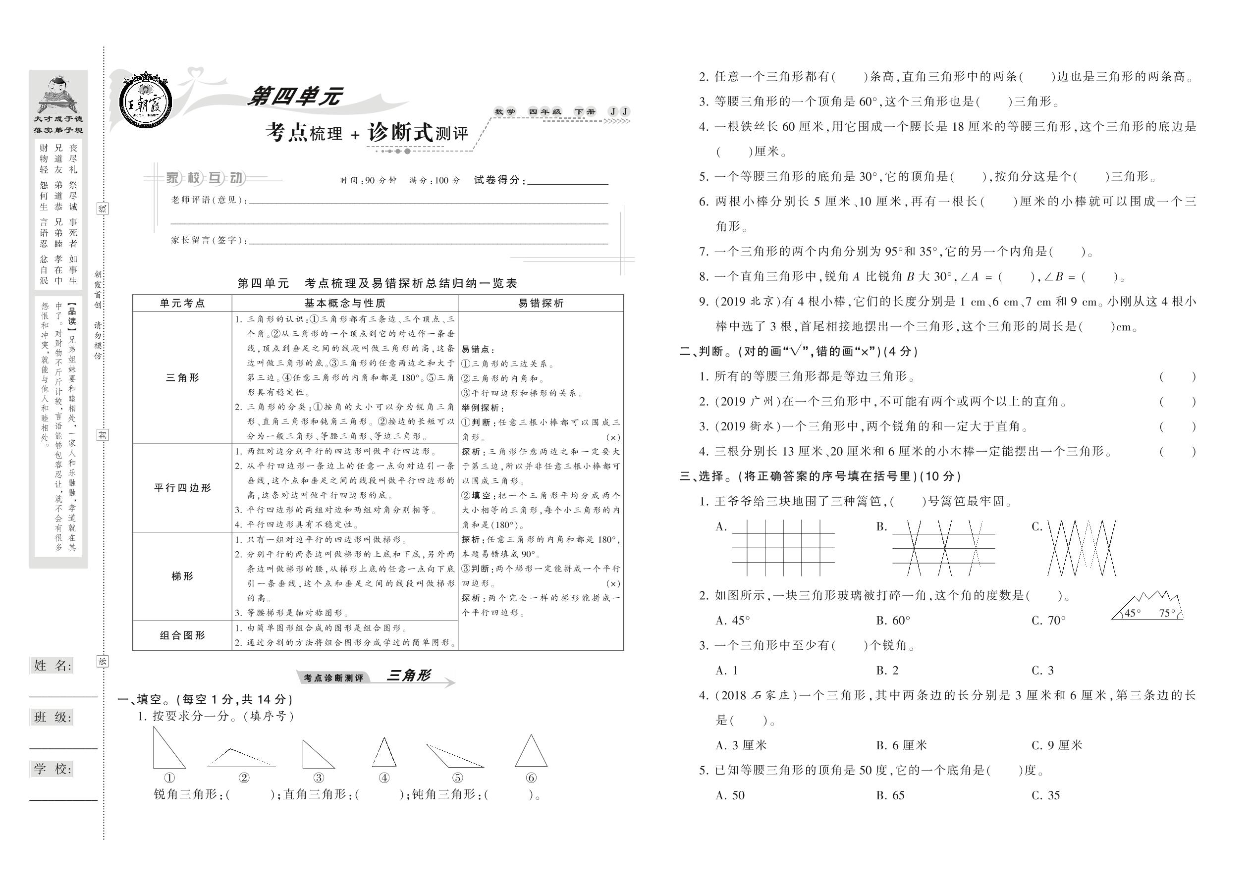 2021下册四年级数学冀教版 第四单元 考点梳理+诊断式测评