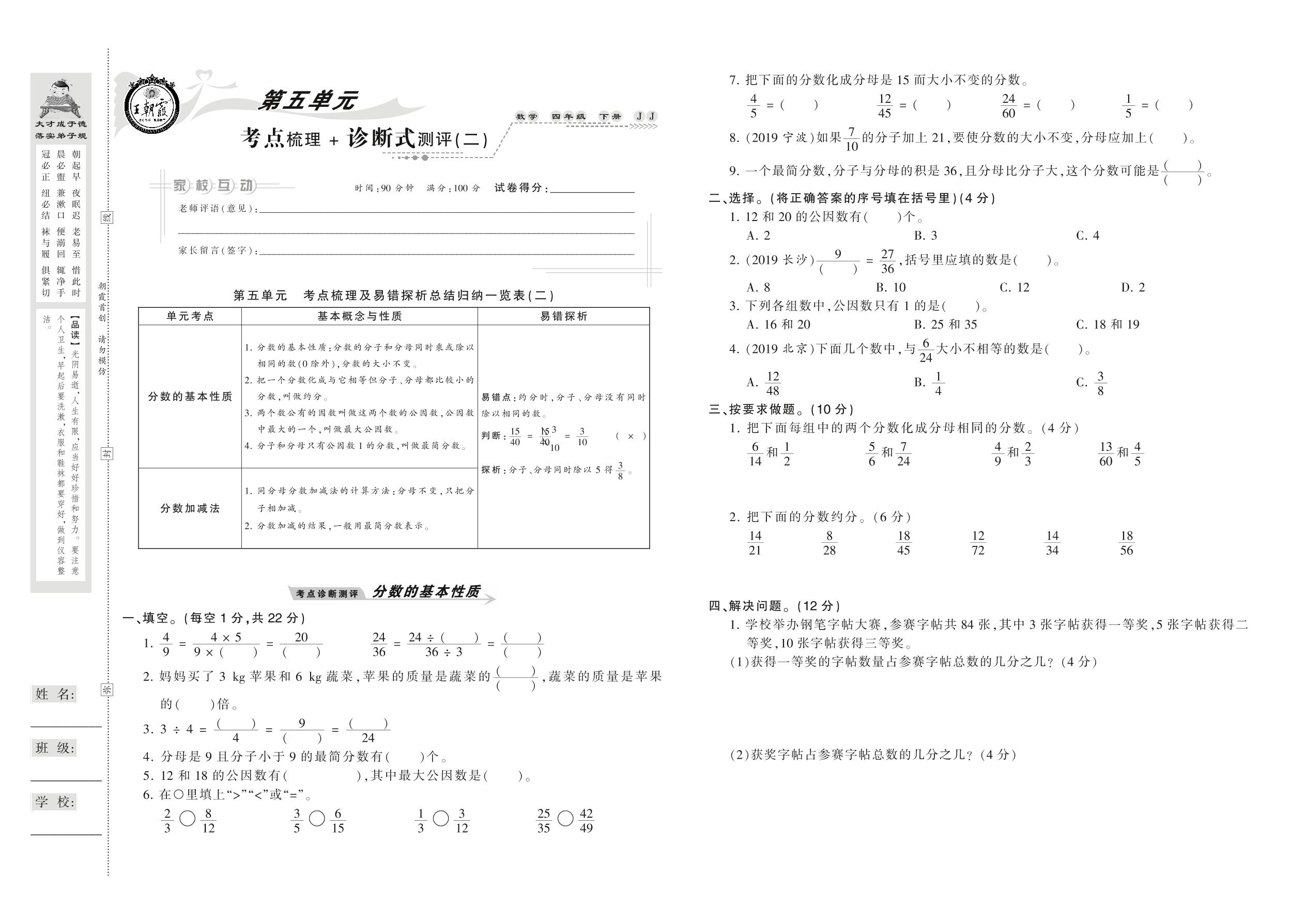 2021下册四年级数学冀教版 第五单元 考点梳理+诊断式测评(二)