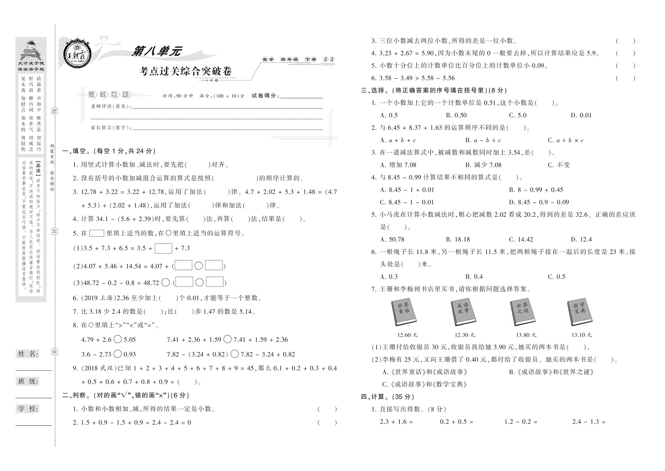 2021下册四年级数学冀教版 第八单元 考点过关综合突破卷