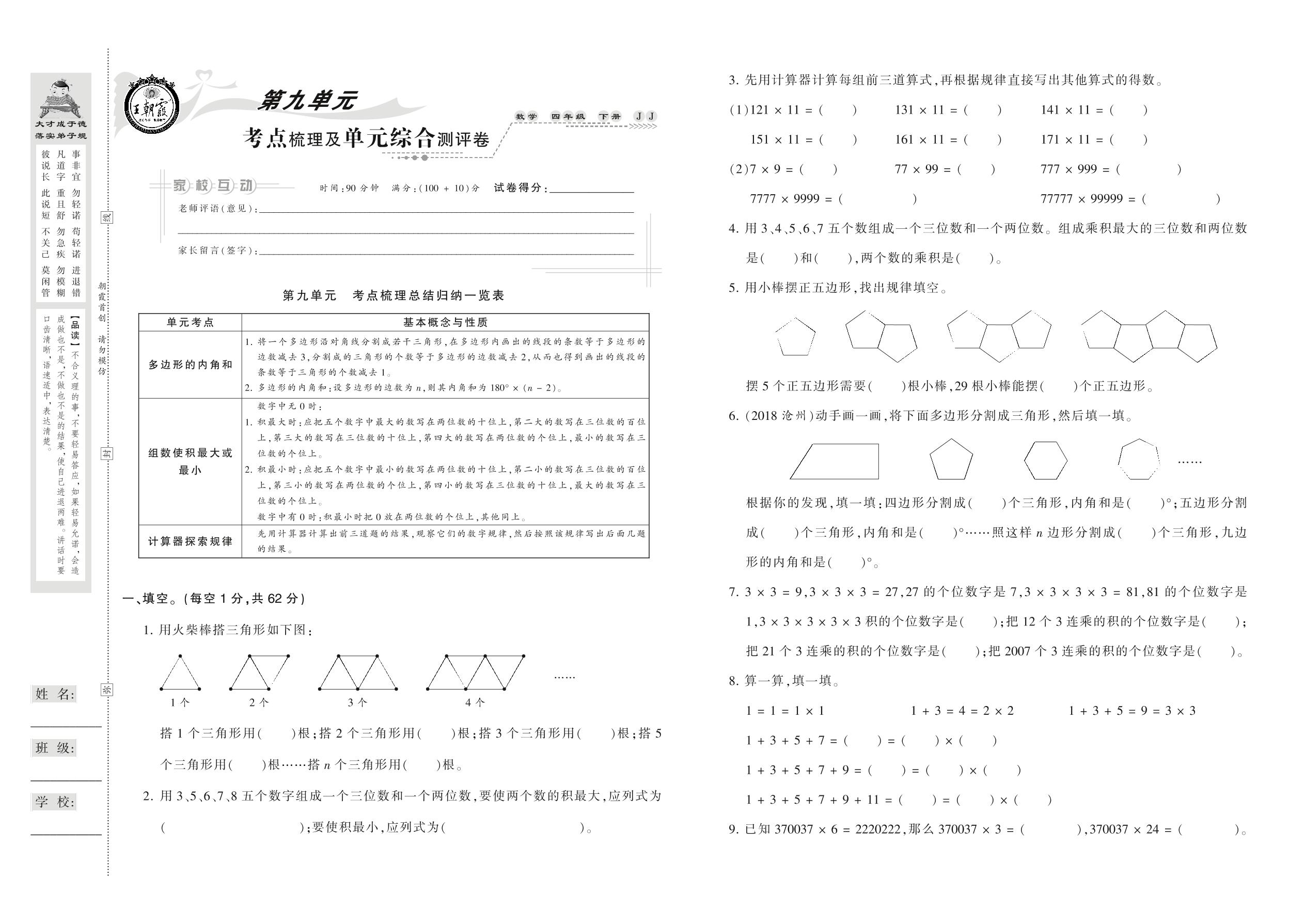 2021下册四年级数学冀教版 第九单元 考点梳理及单元综合测评卷