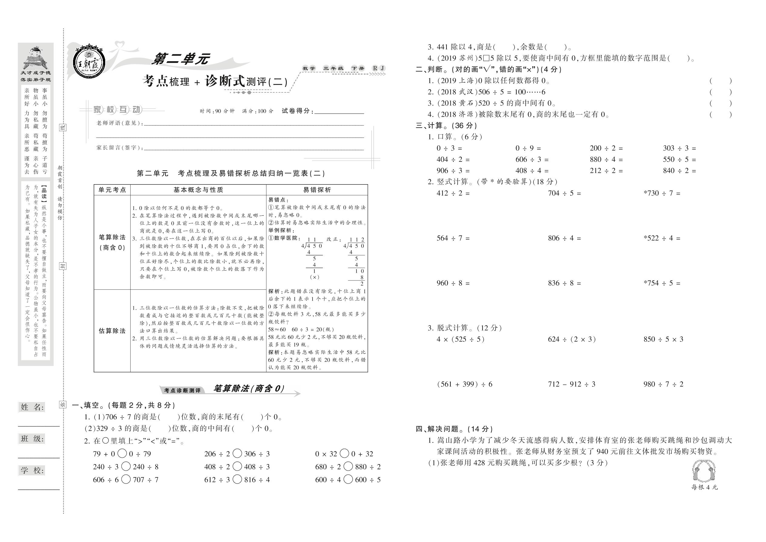 2021下册三年级数学人教版 第二单元 考点梳理+诊断式测评(二)