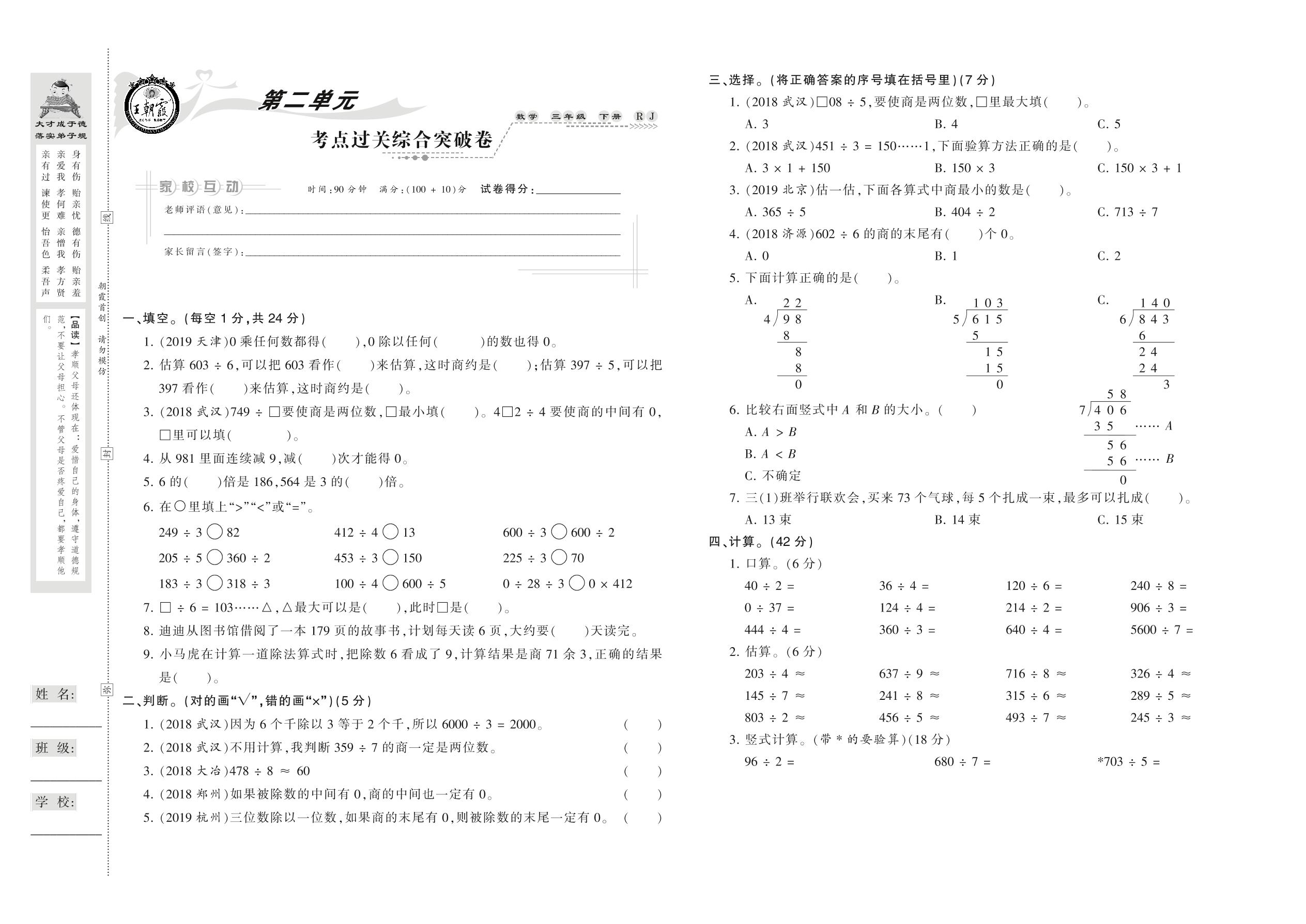 2021下册三年级数学人教版 第二单元 考点过关综合突破卷