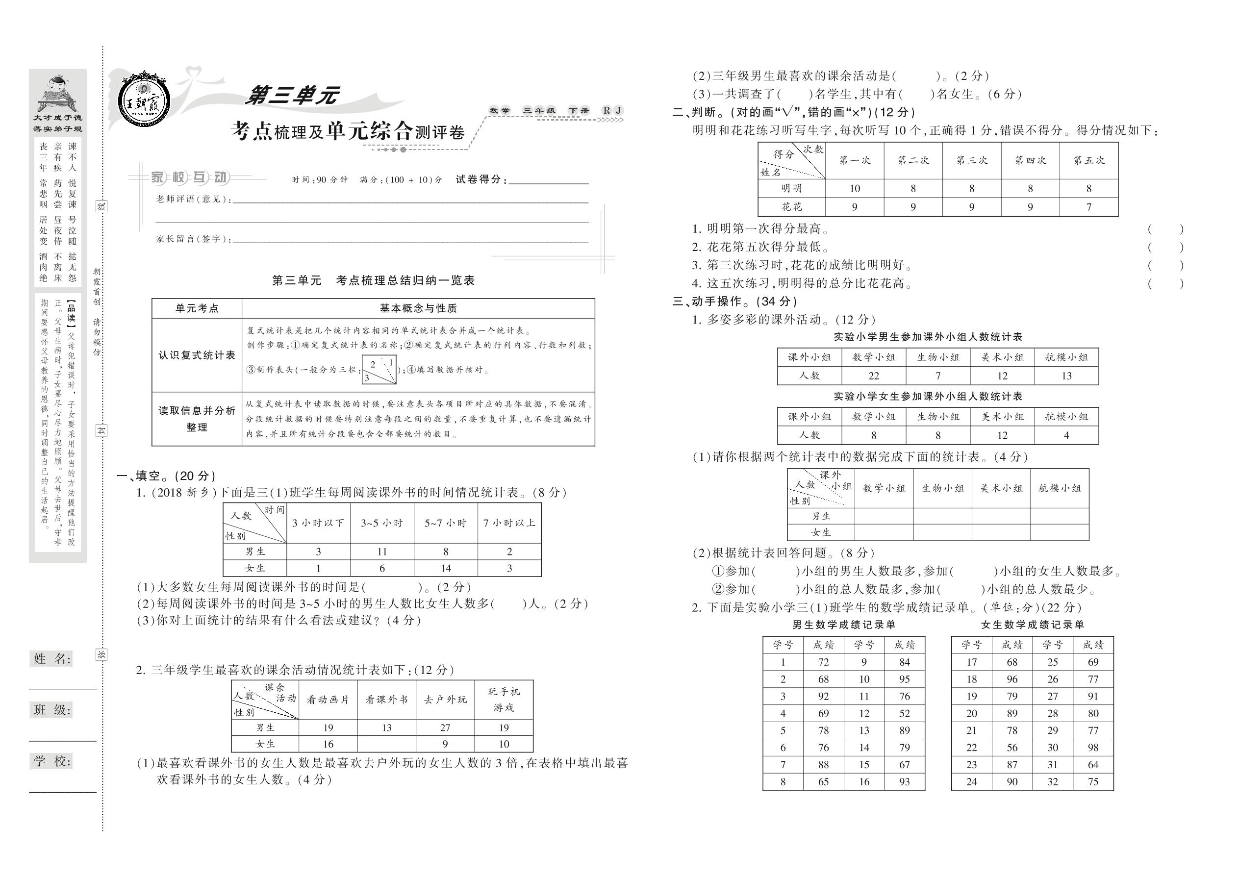 2021下册三年级数学人教版 第三单元 考点梳理及单元综合测评卷