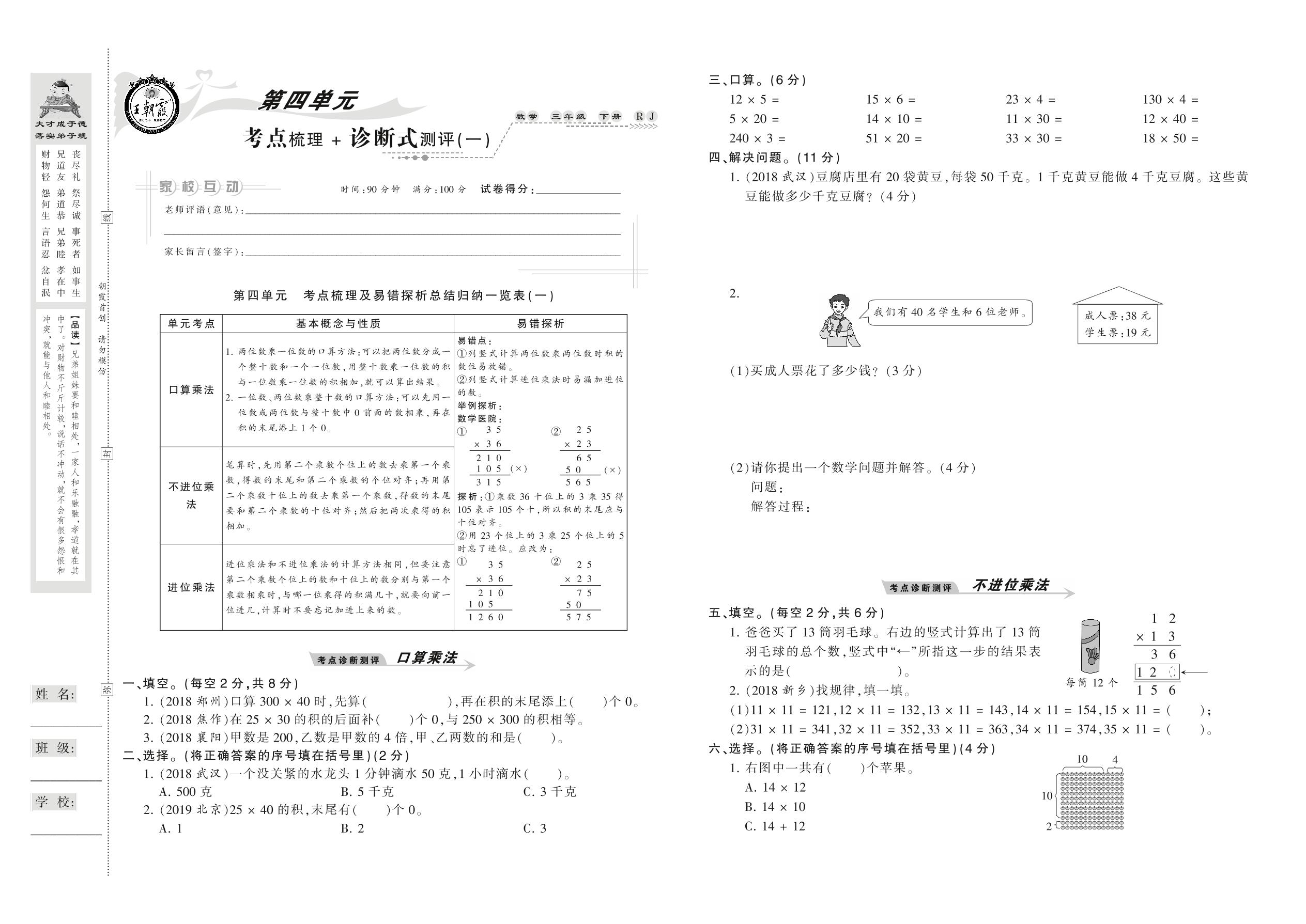2021下册三年级数学人教版 第四单元 考点梳理+诊断式测评(一)
