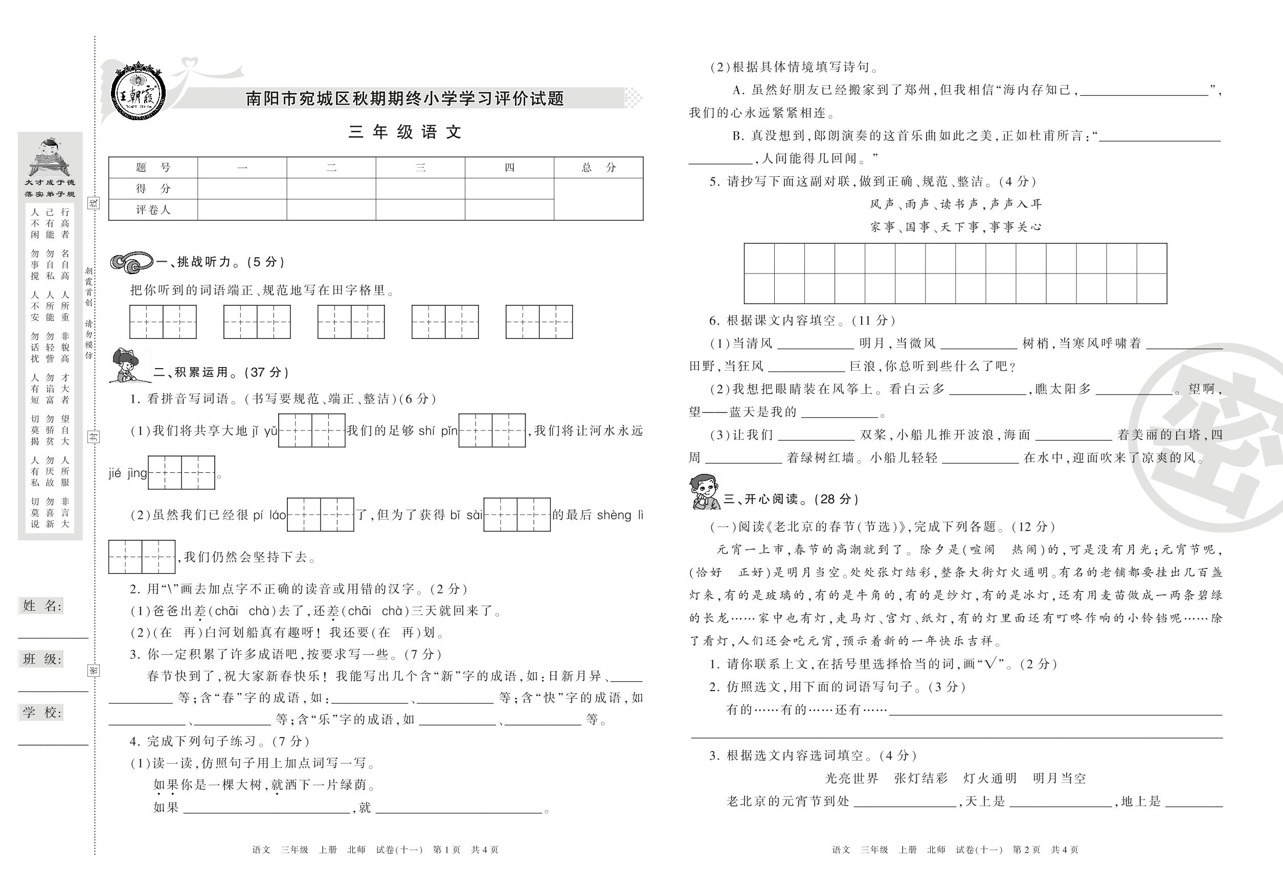 2016-2017学年第一学期南阳市宛城区三年级语文试卷(北师版)【11】