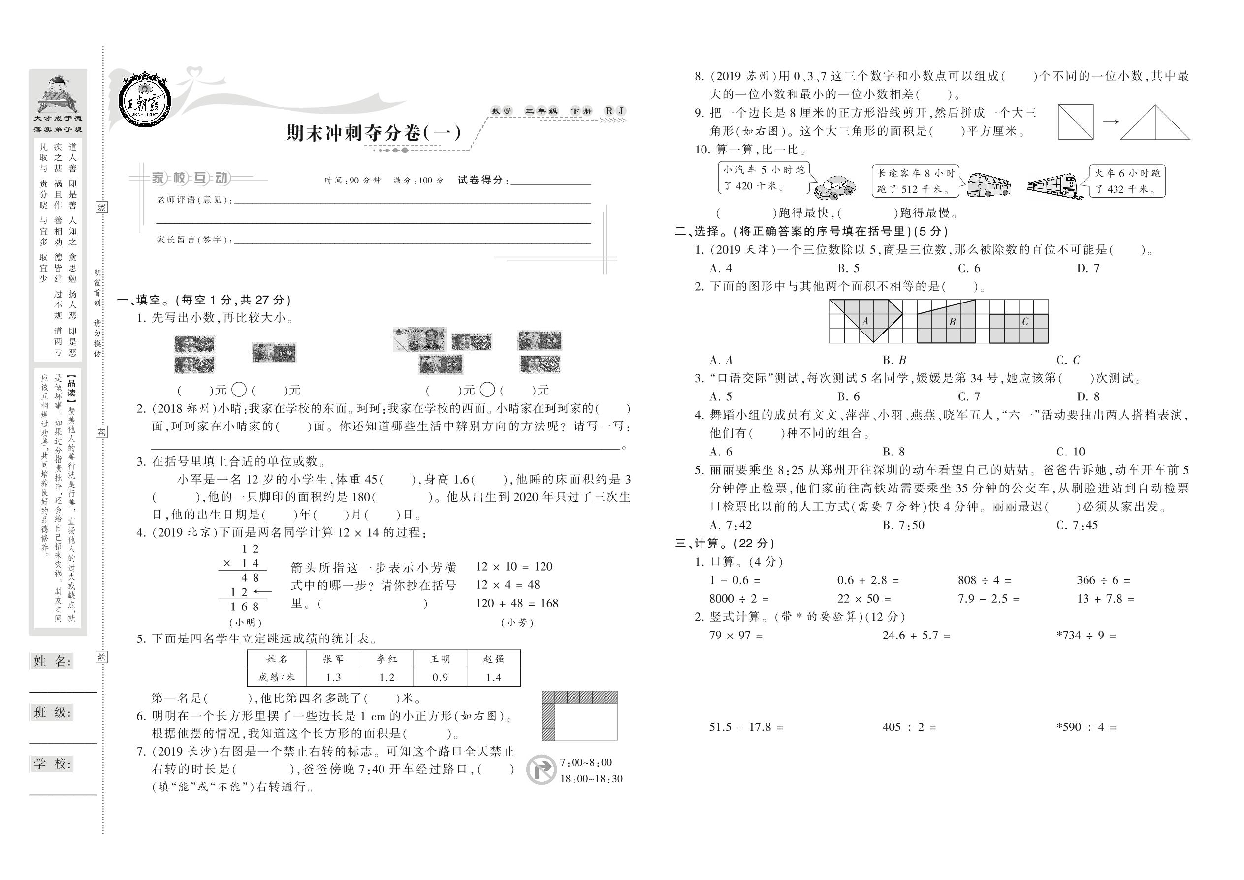 2021下册三年级数学人教版 期末冲刺夺分卷(一)