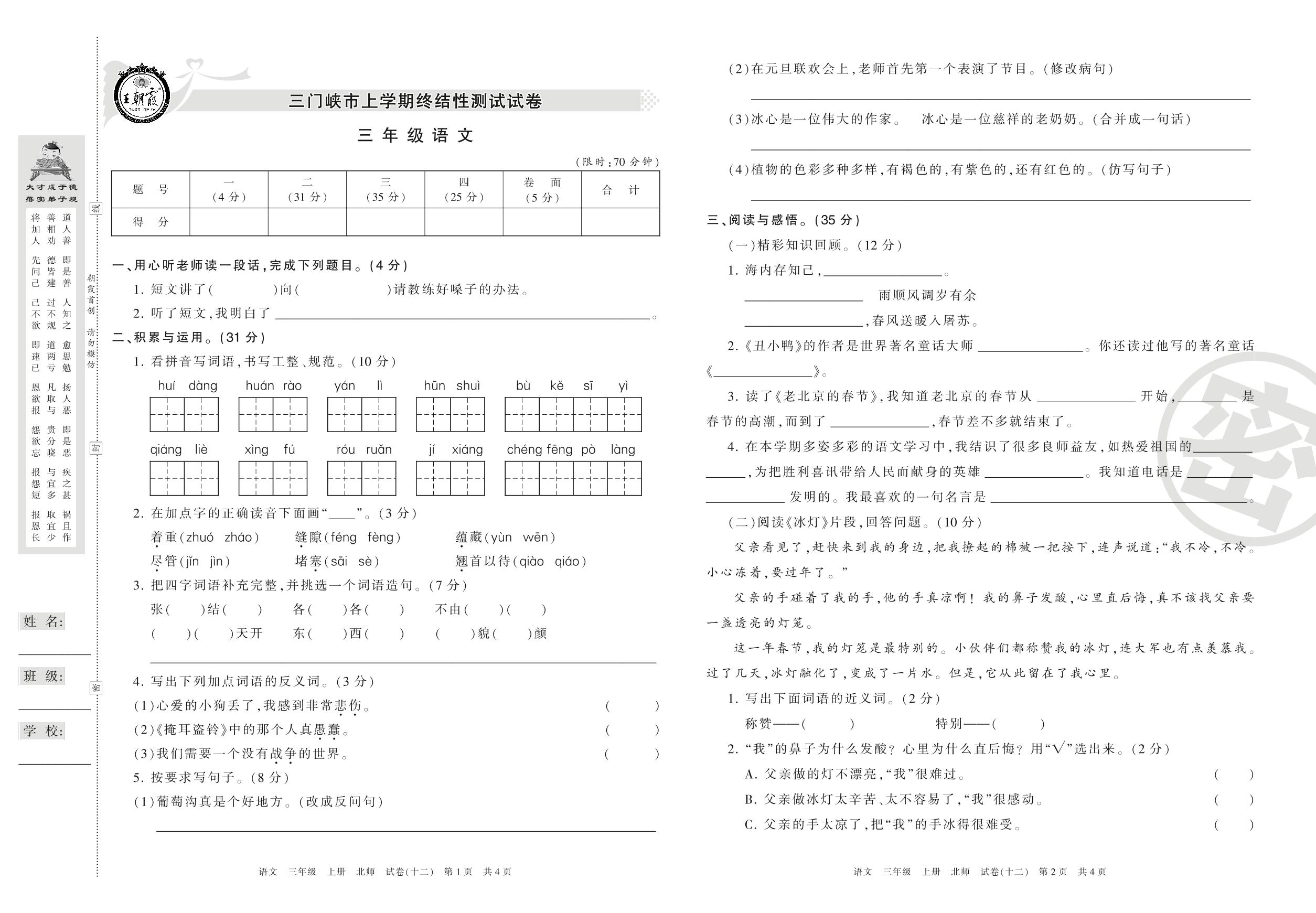 三年级语文北师版上册期末卷