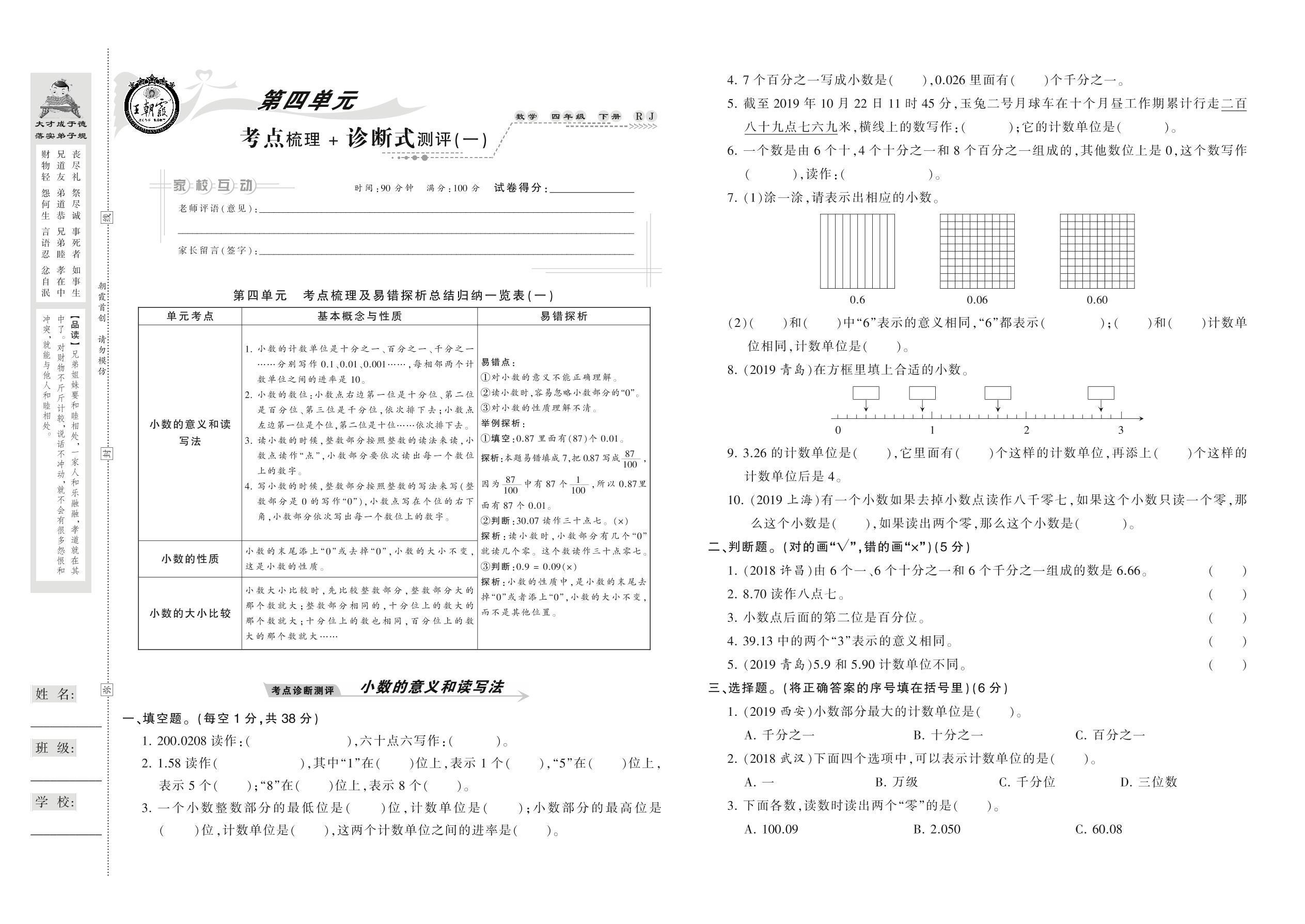 2021下册四年级数学人教版 第四单元 考点梳理+诊断式测评(一)