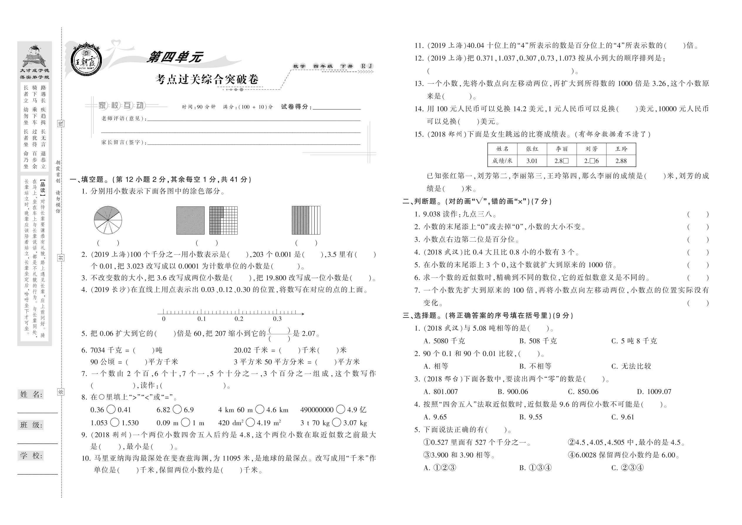 2021下册四年级数学人教版 第四单元 考点过关综合突破卷