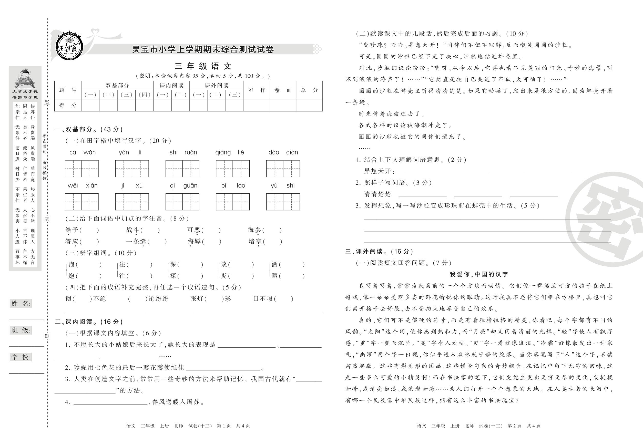 三年级语文北师版上册期末卷