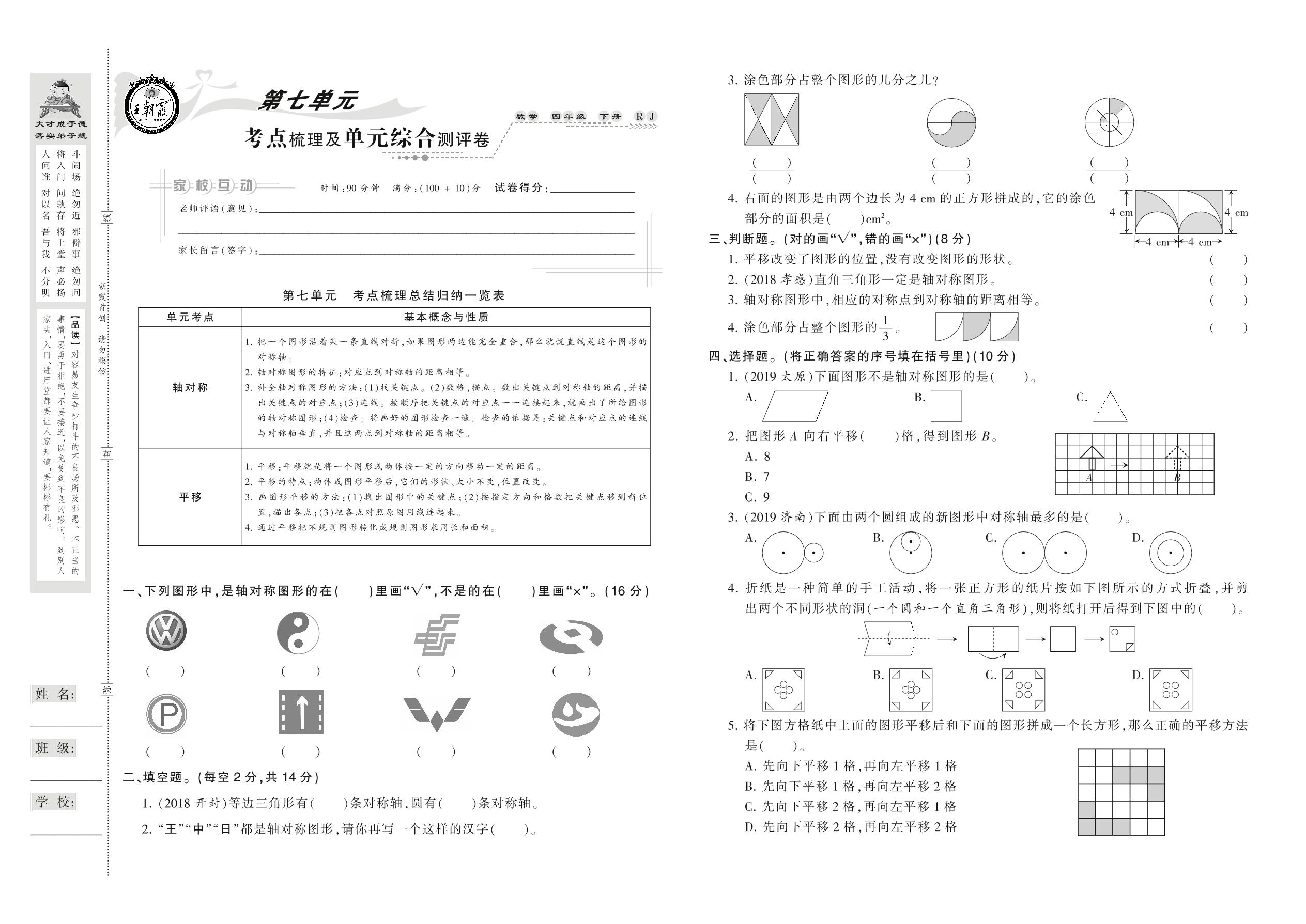 2021下册四年级数学人教版 第七单元 考点梳理及单元综合测评卷