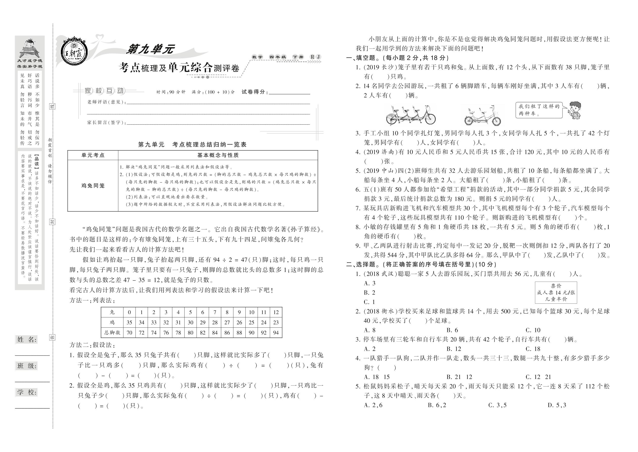 2021下册四年级数学人教版 第九单元 考点梳理及单元综合测评卷