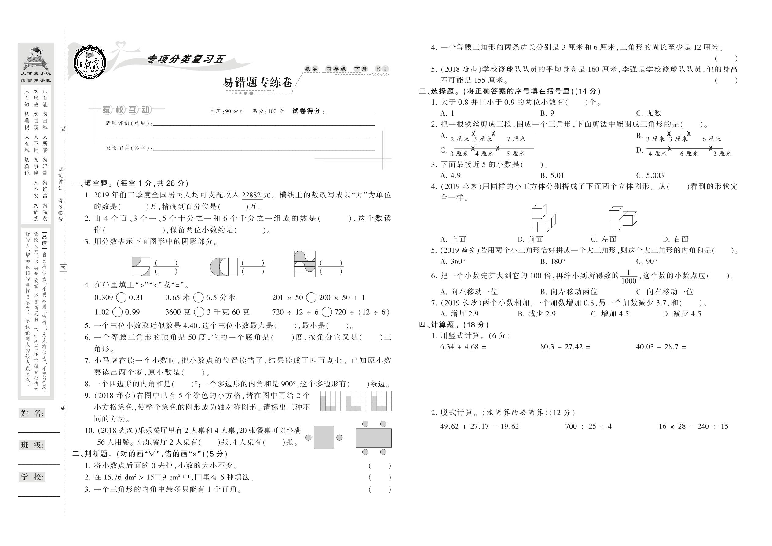 2021下册四年级数学人教版 易错题专练卷