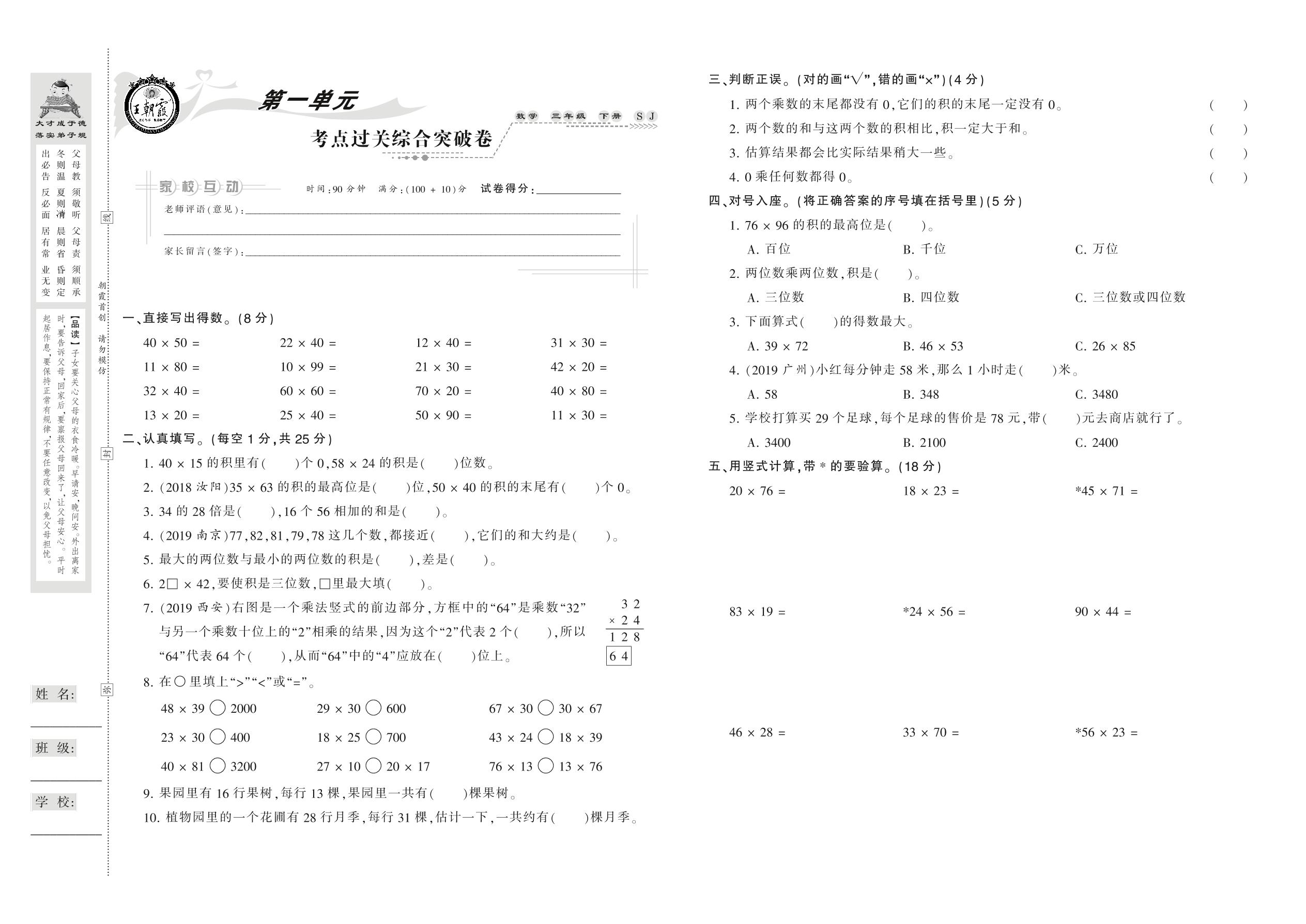 2021下册三年级数学苏教版 第一单元 考点过关综合突破卷