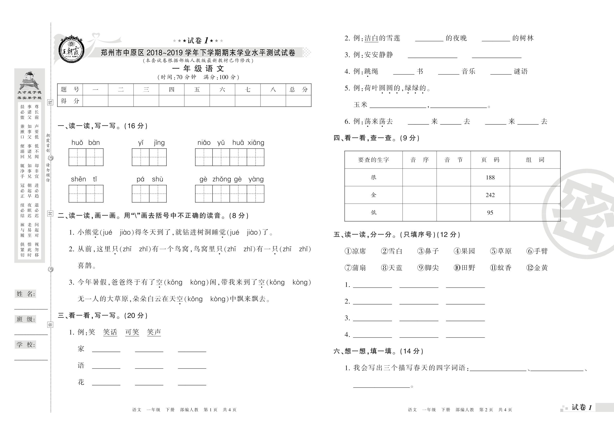 2018-2019学年第二学期郑州市中原区一年级语文试卷(人教版)【1】