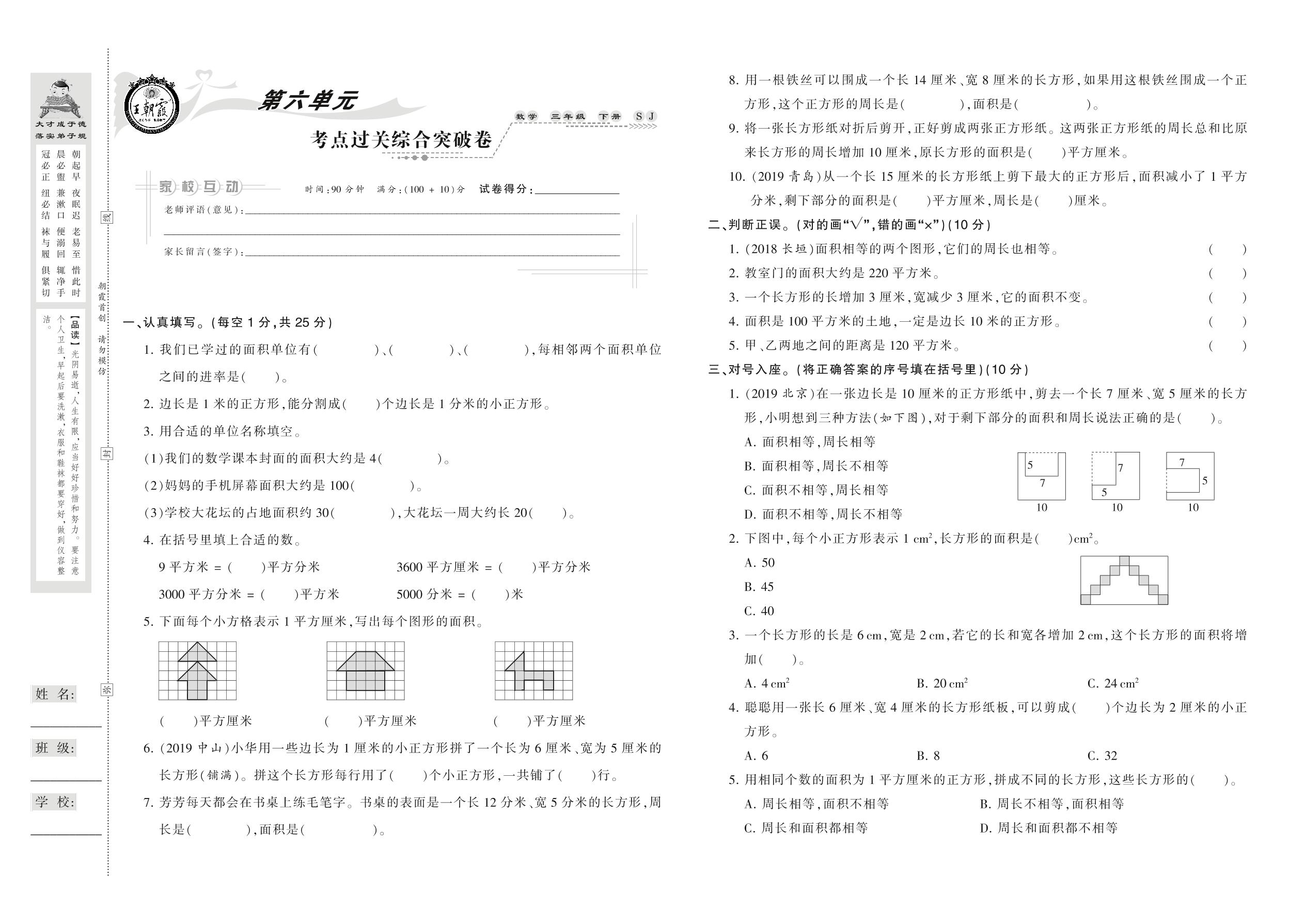 2021下册三年级数学苏教版 第六单元 考点过关综合突破卷