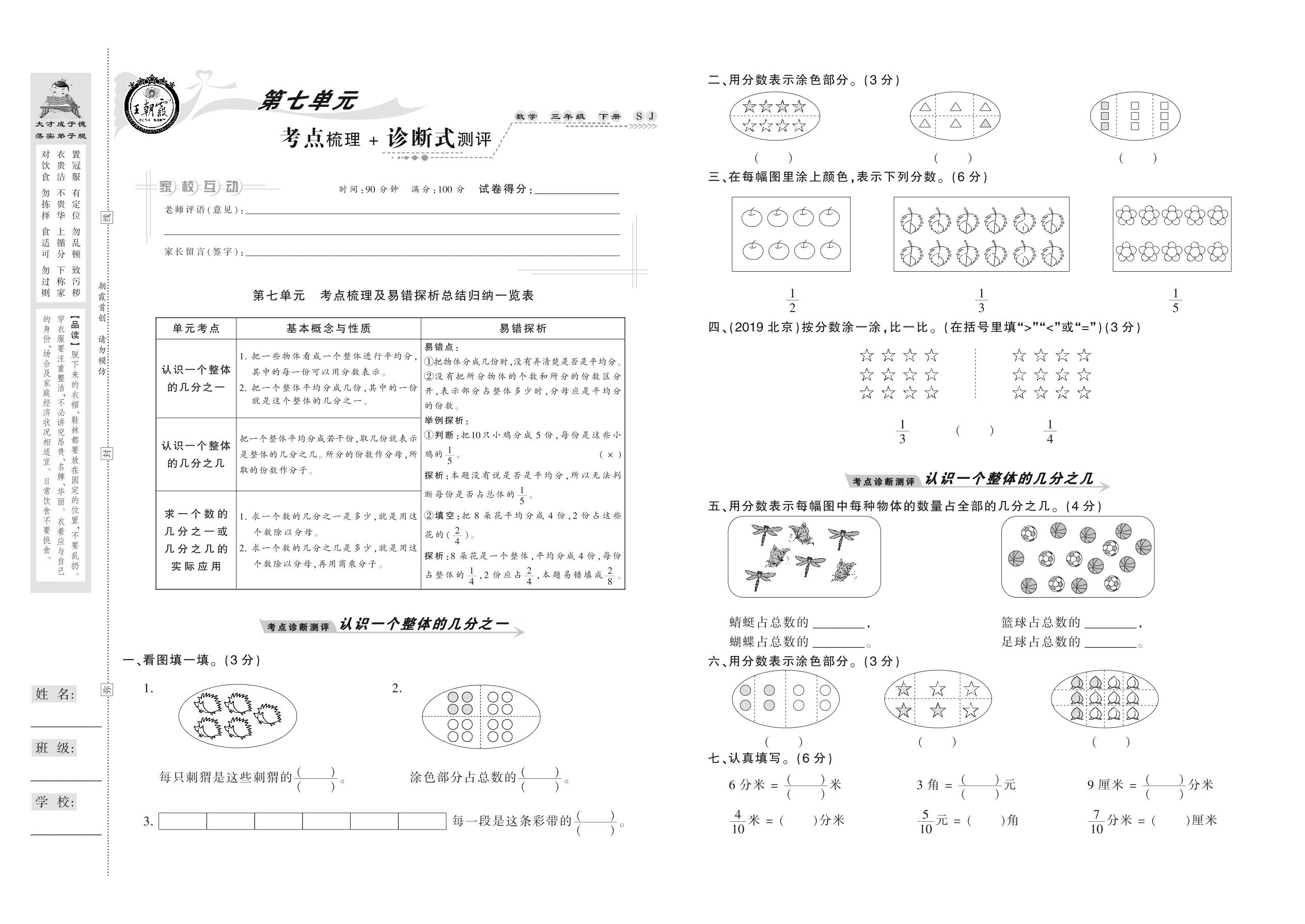2021下册三年级数学苏教版 第七单元 考点梳理+诊断式测评