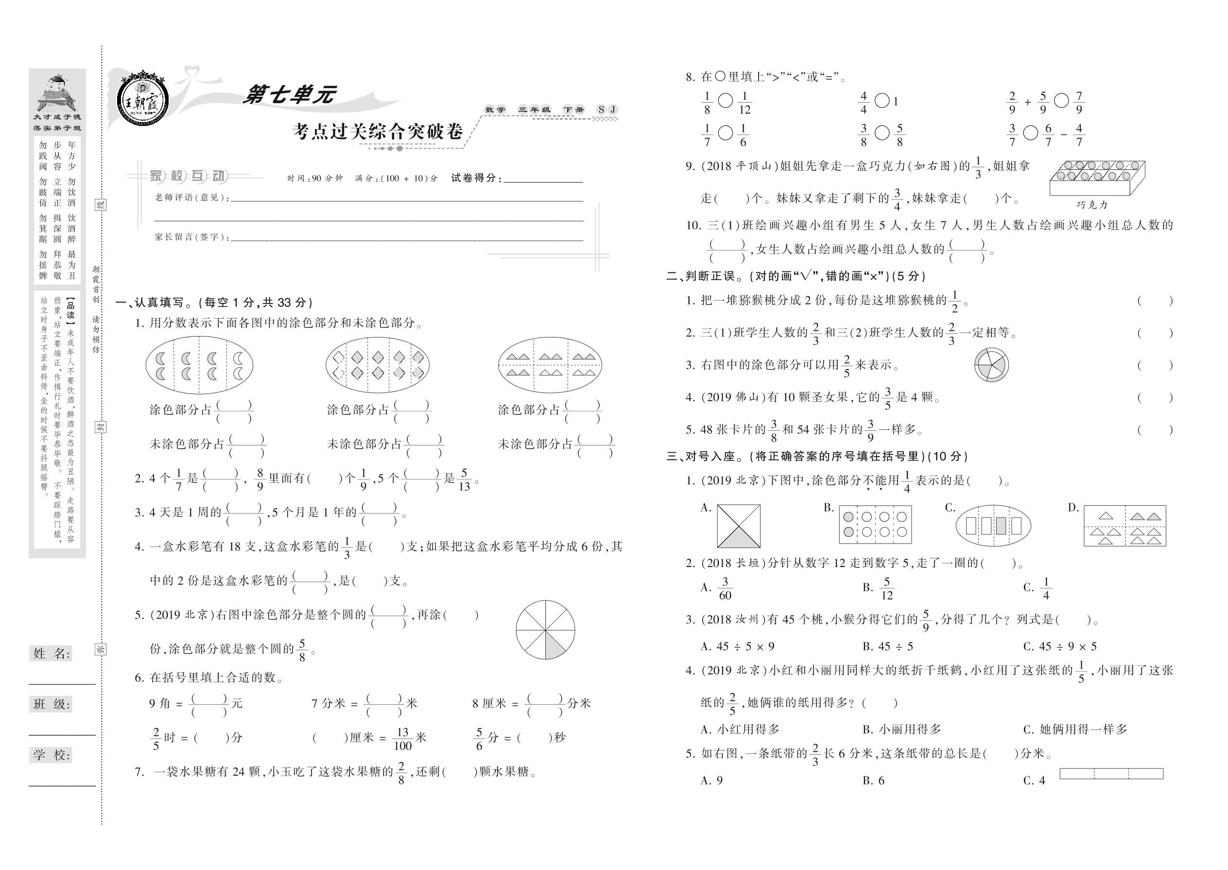 2021下册三年级数学苏教版 第七单元 考点过关综合突破卷