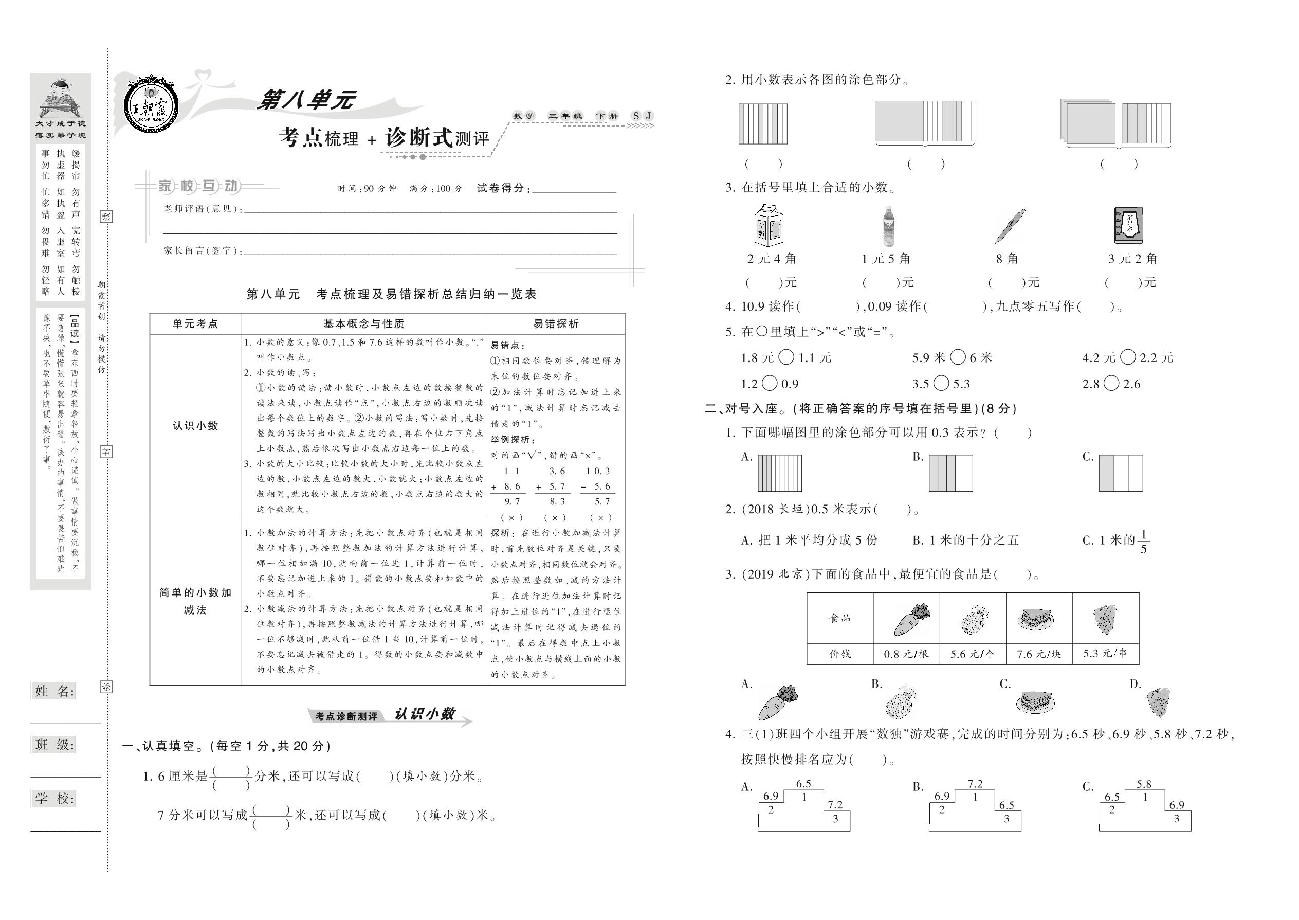 2021下册三年级数学苏教版 第八单元 考点梳理+诊断式测评