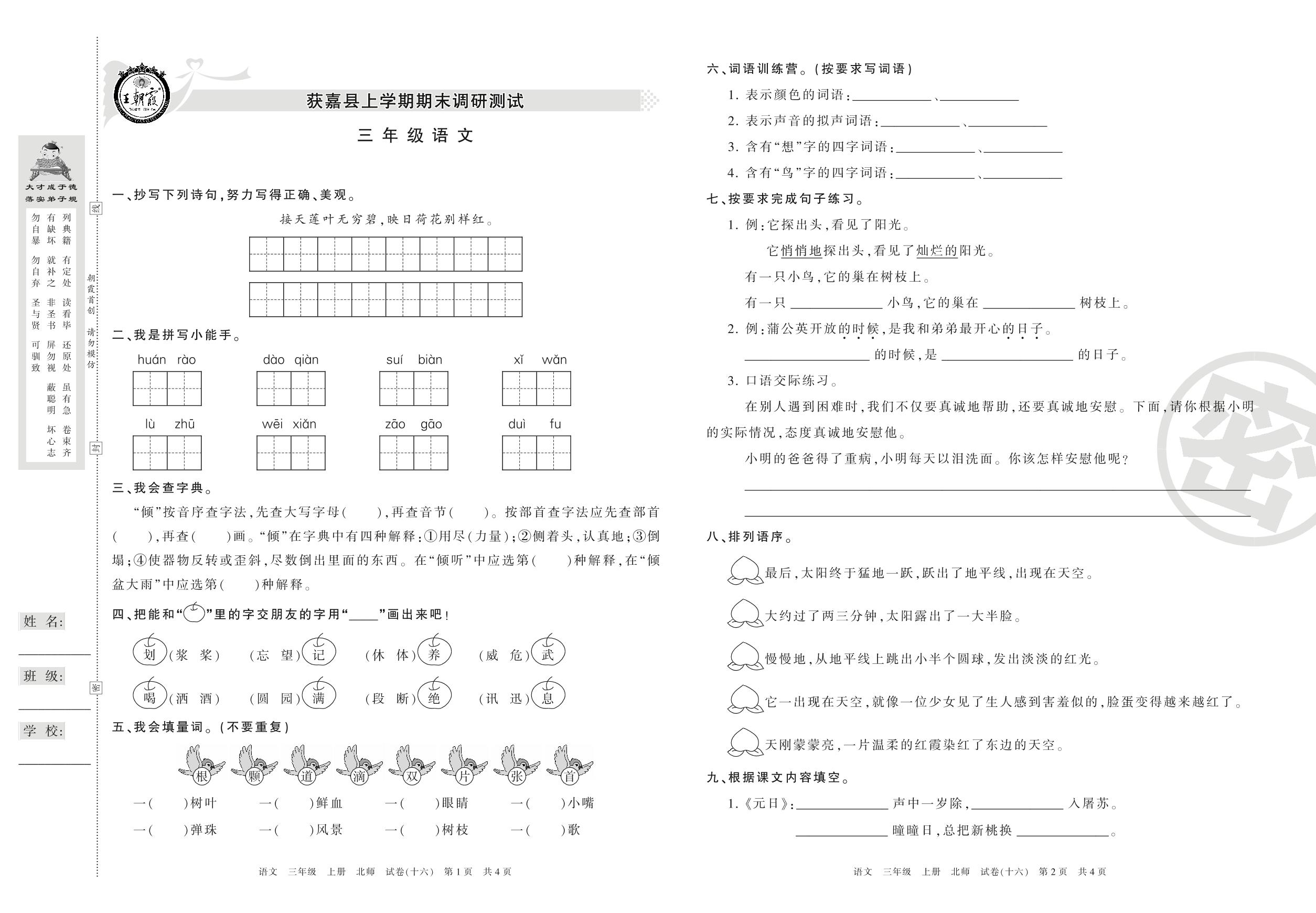 2016-2017学年第一学期新乡市获嘉县三年级语文试卷(北师版)【16】