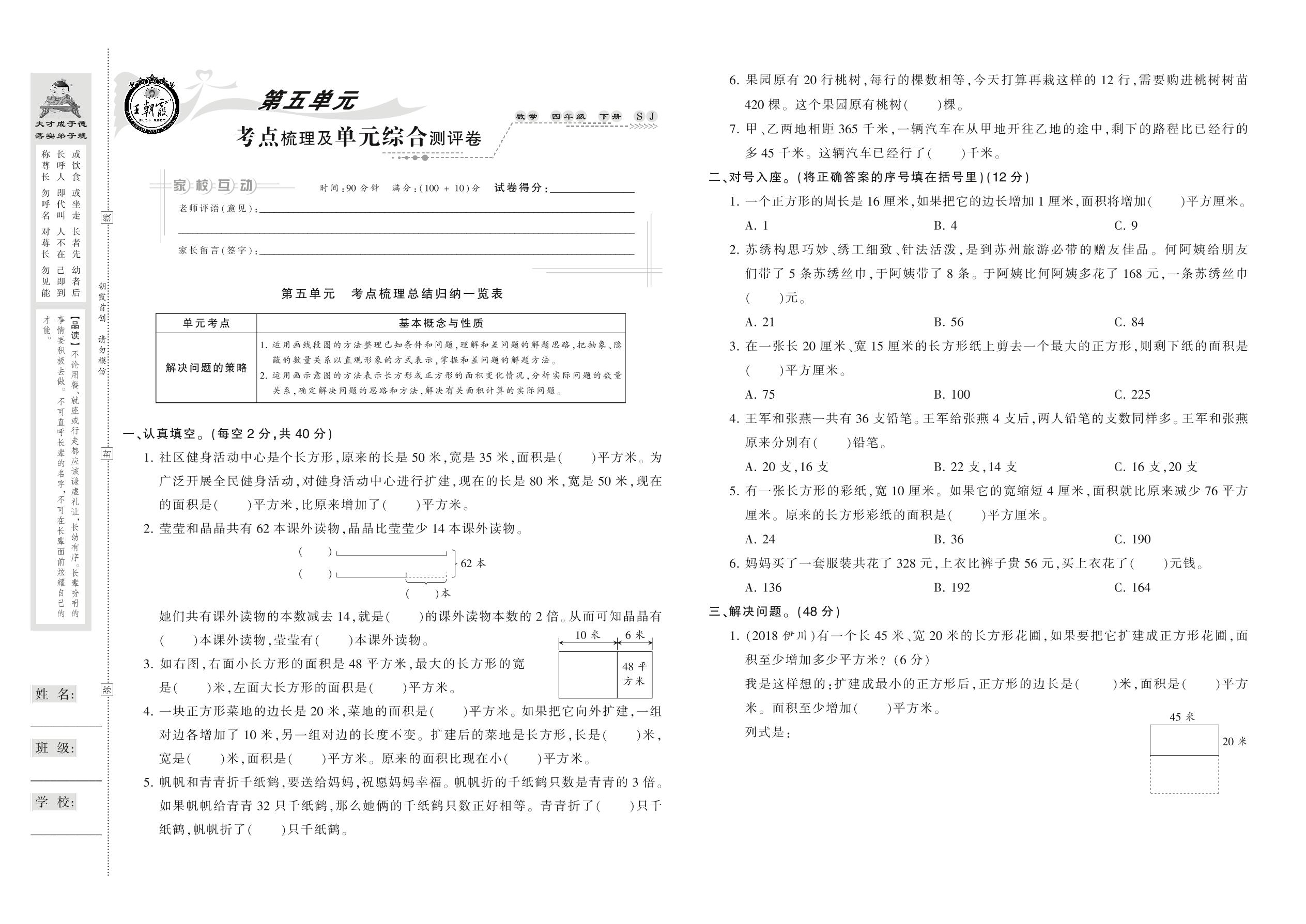 2021下册四年级数学苏教版 第五单元 考点梳理及单元综合测评卷