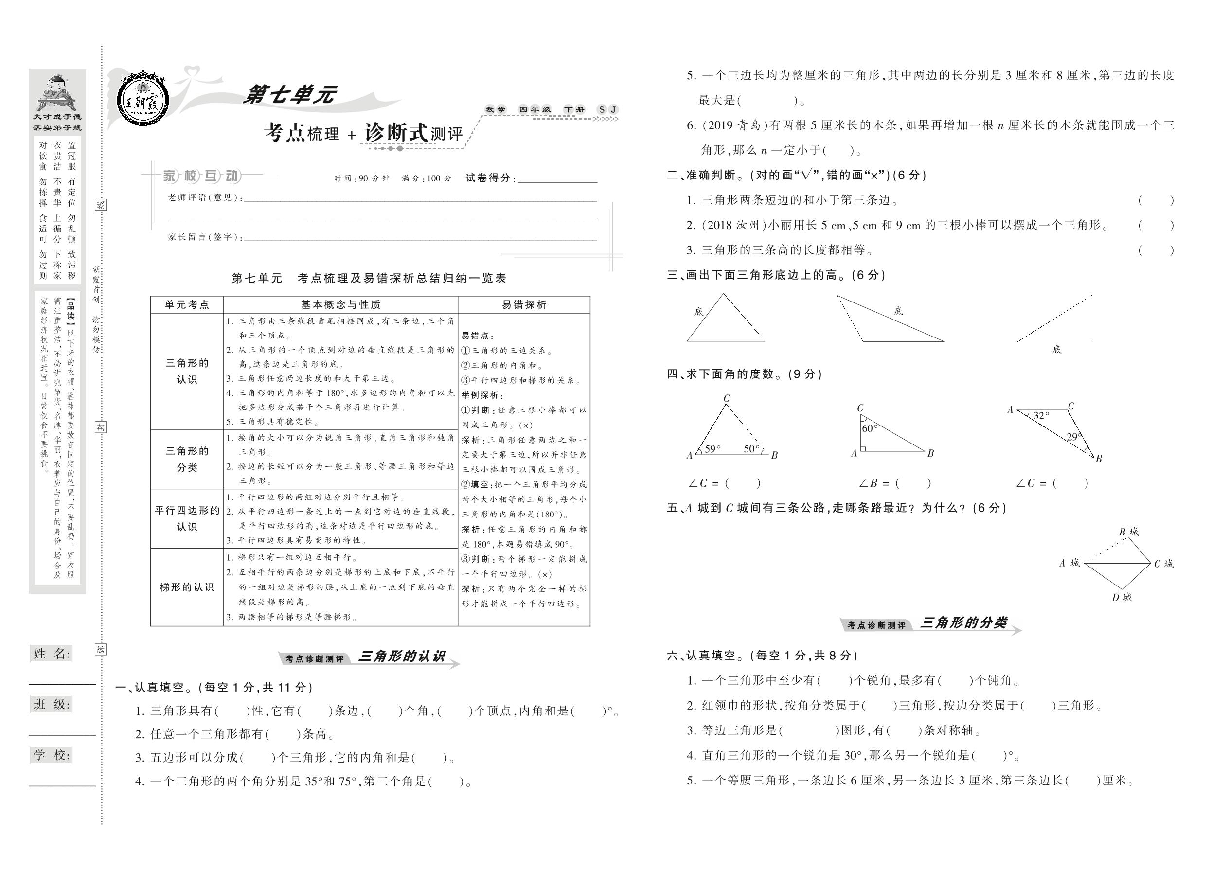2021下册四年级数学苏教版 第七单元 考点梳理+诊断式测评