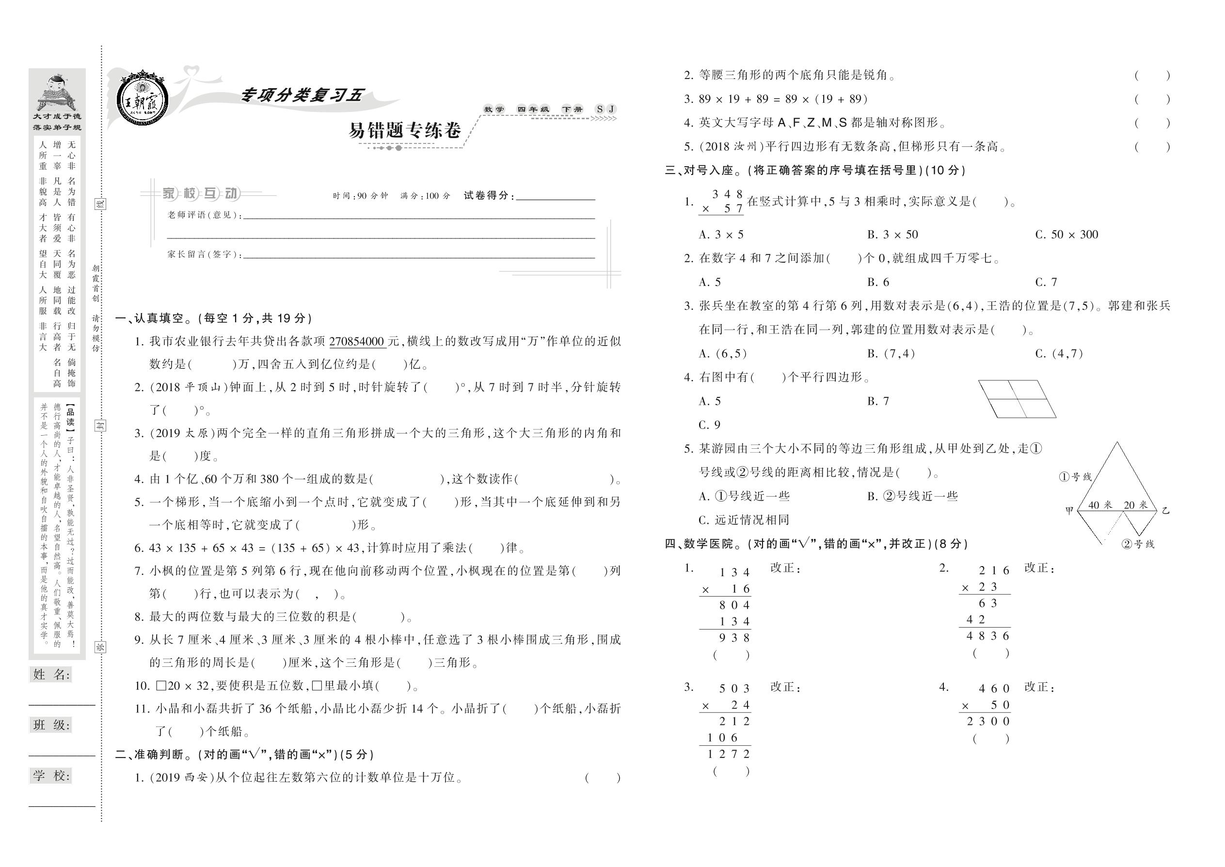 2021下册四年级数学苏教版 易错题专练卷