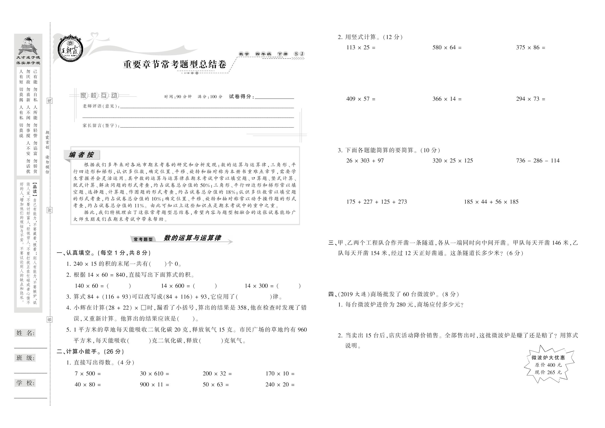 2021下册四年级数学苏教版 重要章节常考题型总结卷
