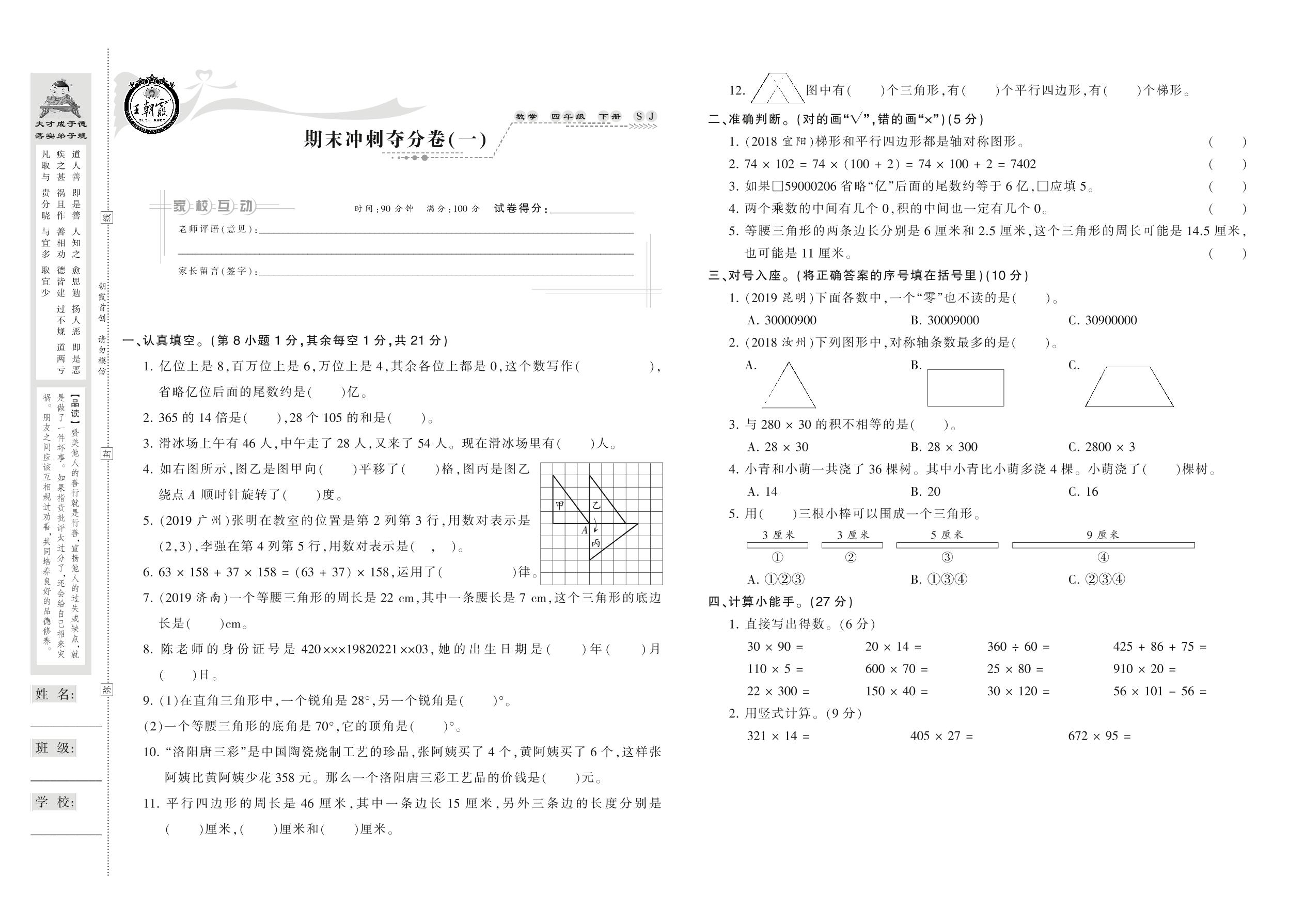 2021下册四年级数学苏教版 期末冲刺夺分卷(一)