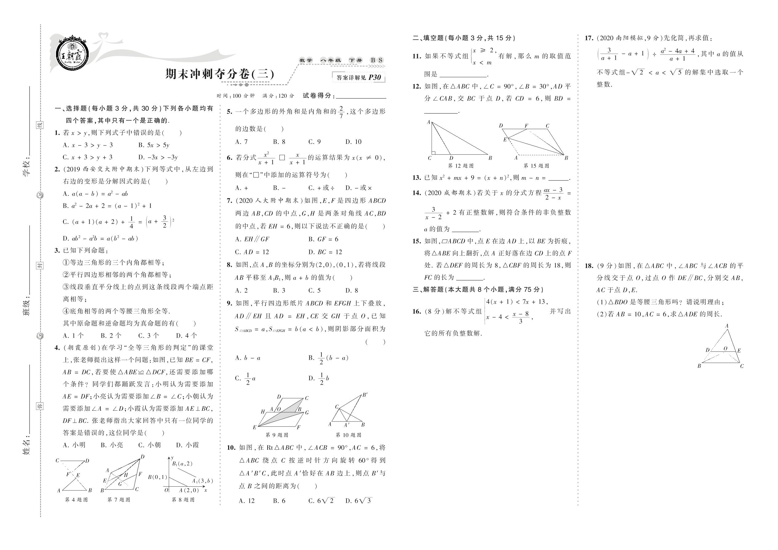 2021下册八年级数学北师版 期末冲刺夺分卷(三)