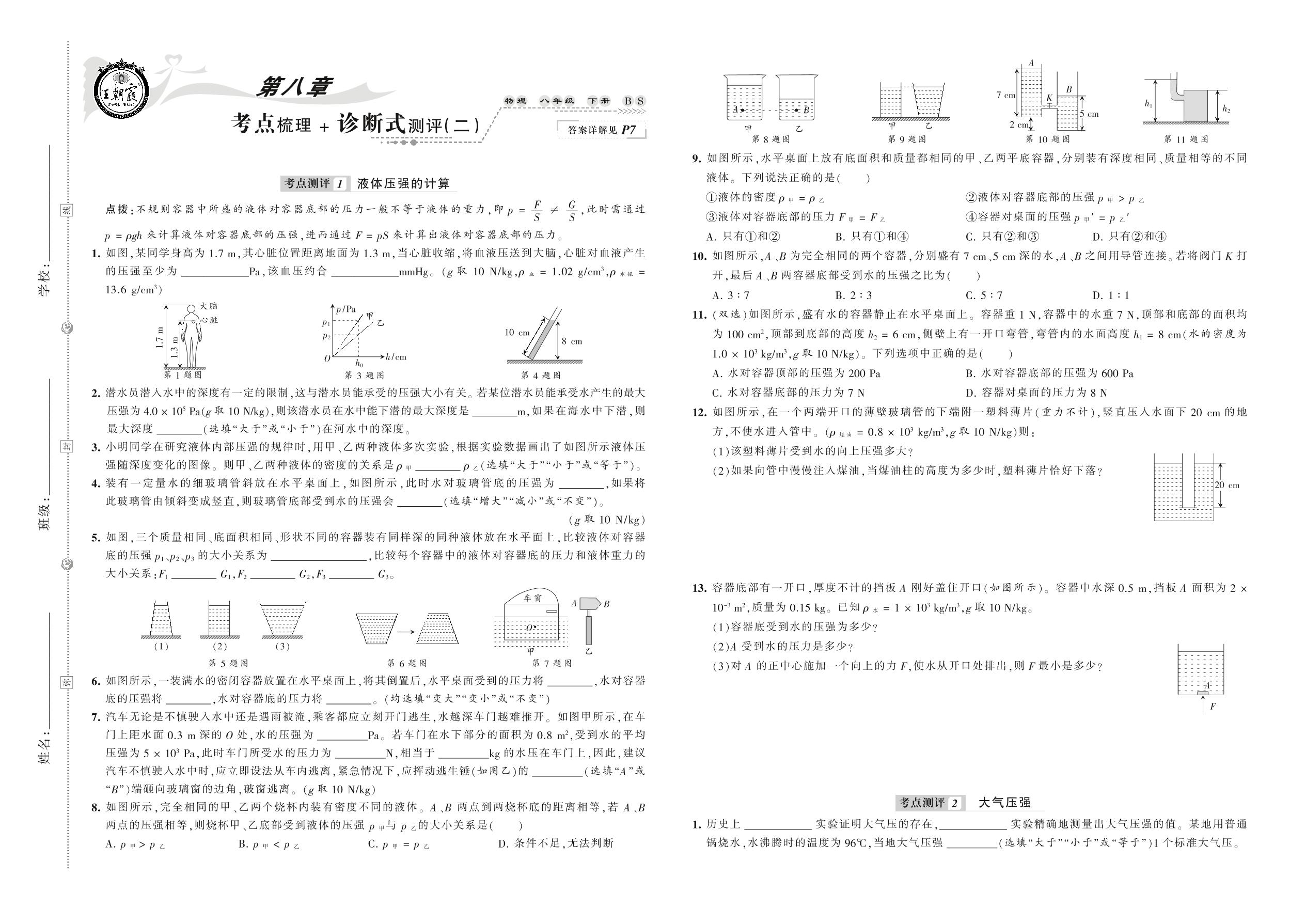 2021下册八年级物理北师版 第八章 考点梳理 + 诊断式测评(二)