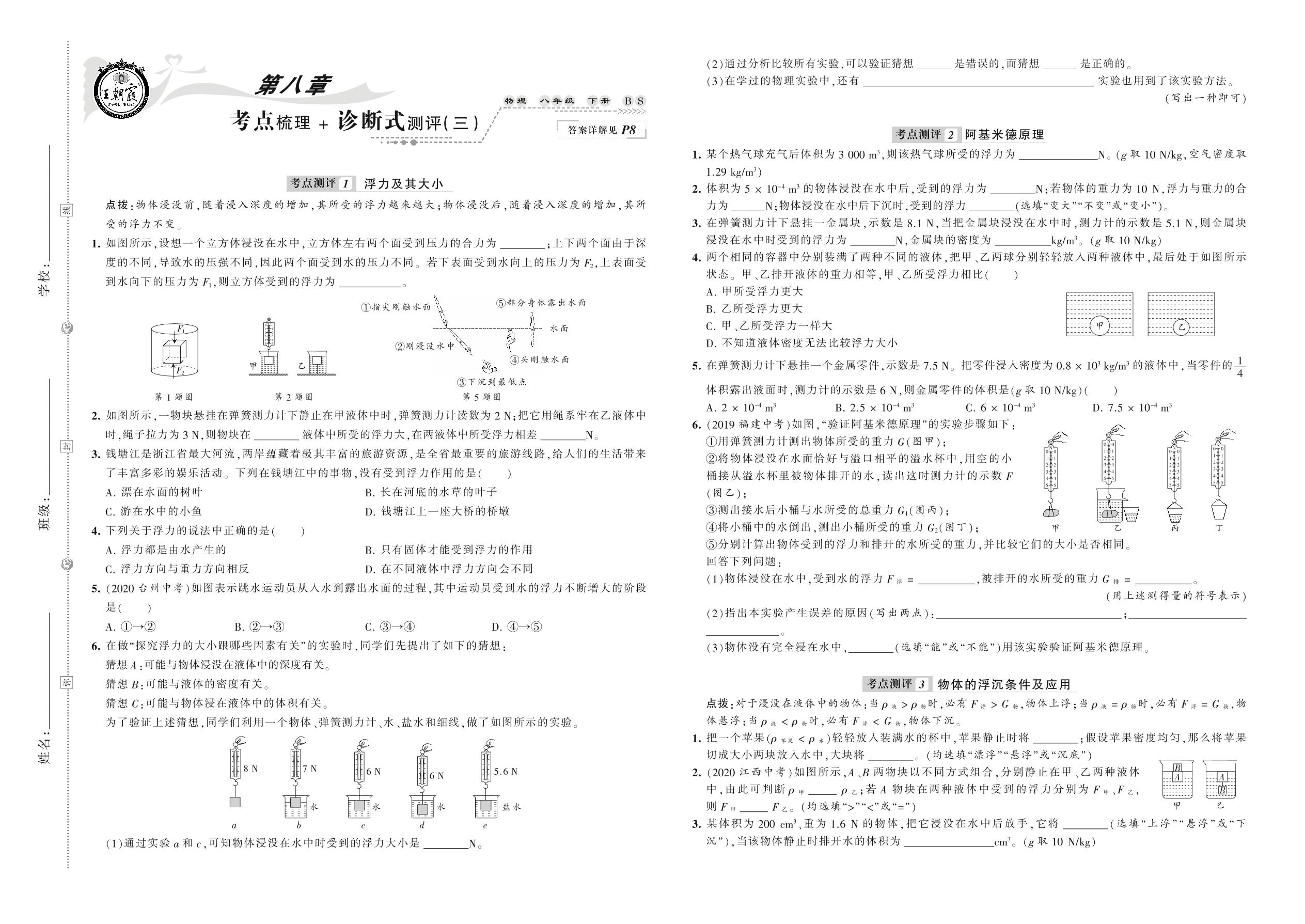 2021下册八年级物理北师版 第八章 考点梳理 + 诊断式测评(三)