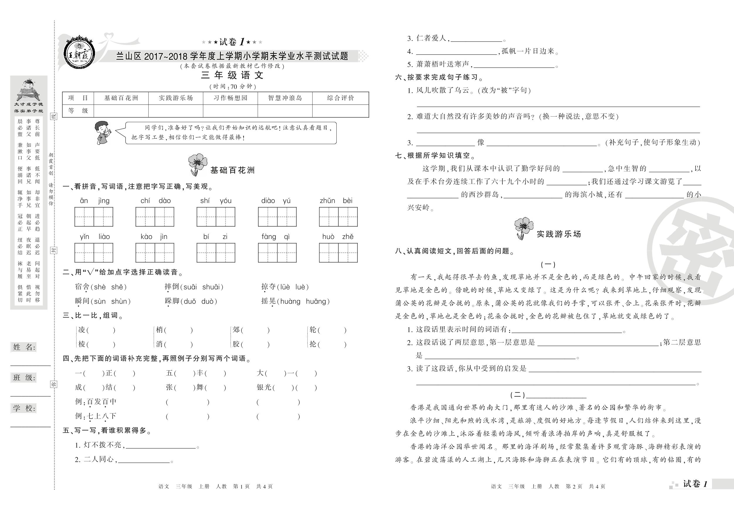 2017-2018学年第一学期临沂市兰山区三年级语文试卷(人教版)【1】