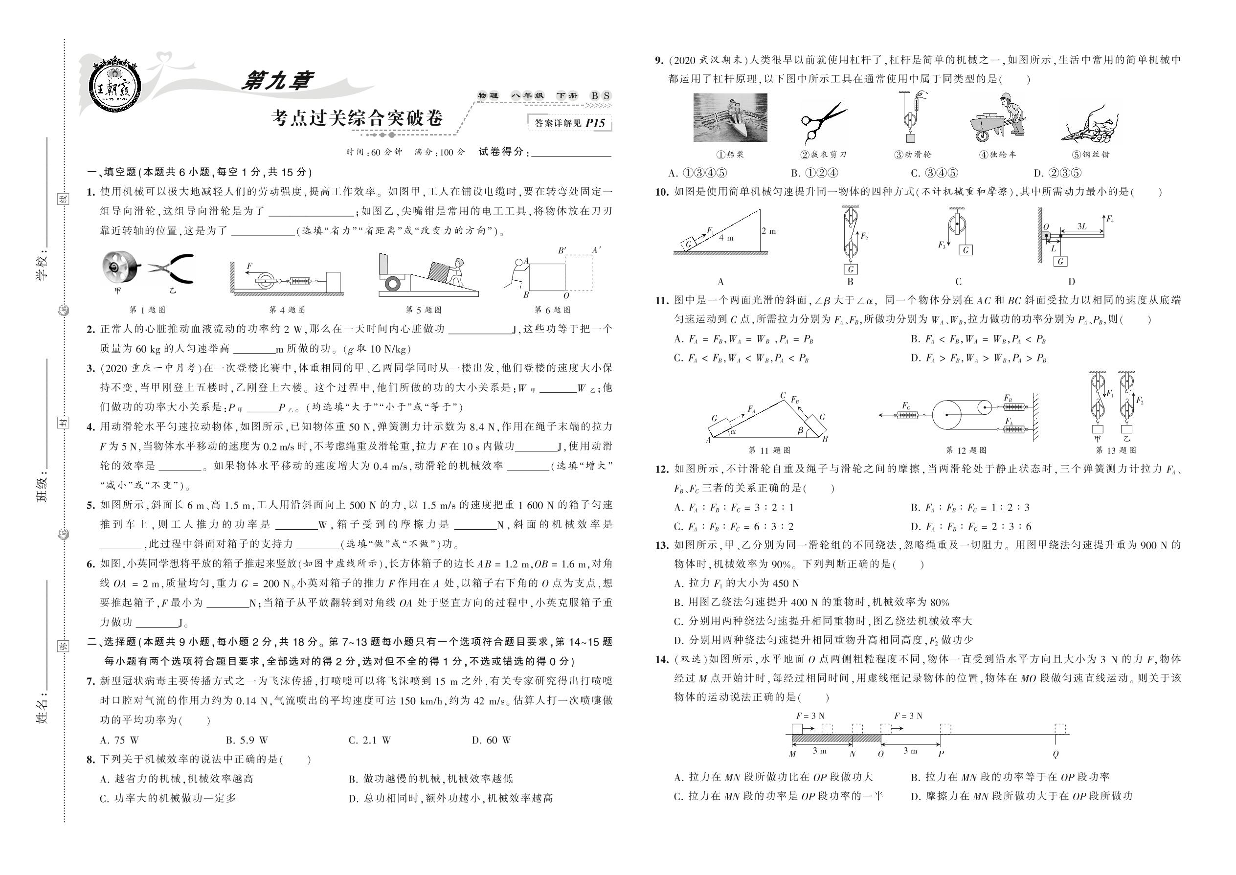 2021下册八年级物理北师版 第九章 考点过关综合突破卷