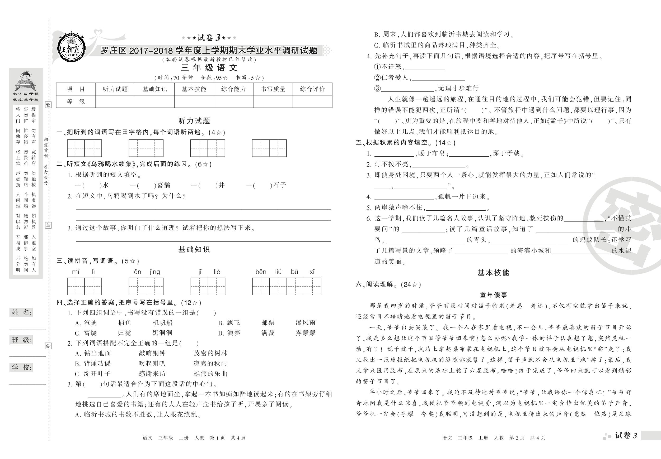 2017-2018学年第一学期临沂市罗庄区三年级语文试卷(人教版)【3】