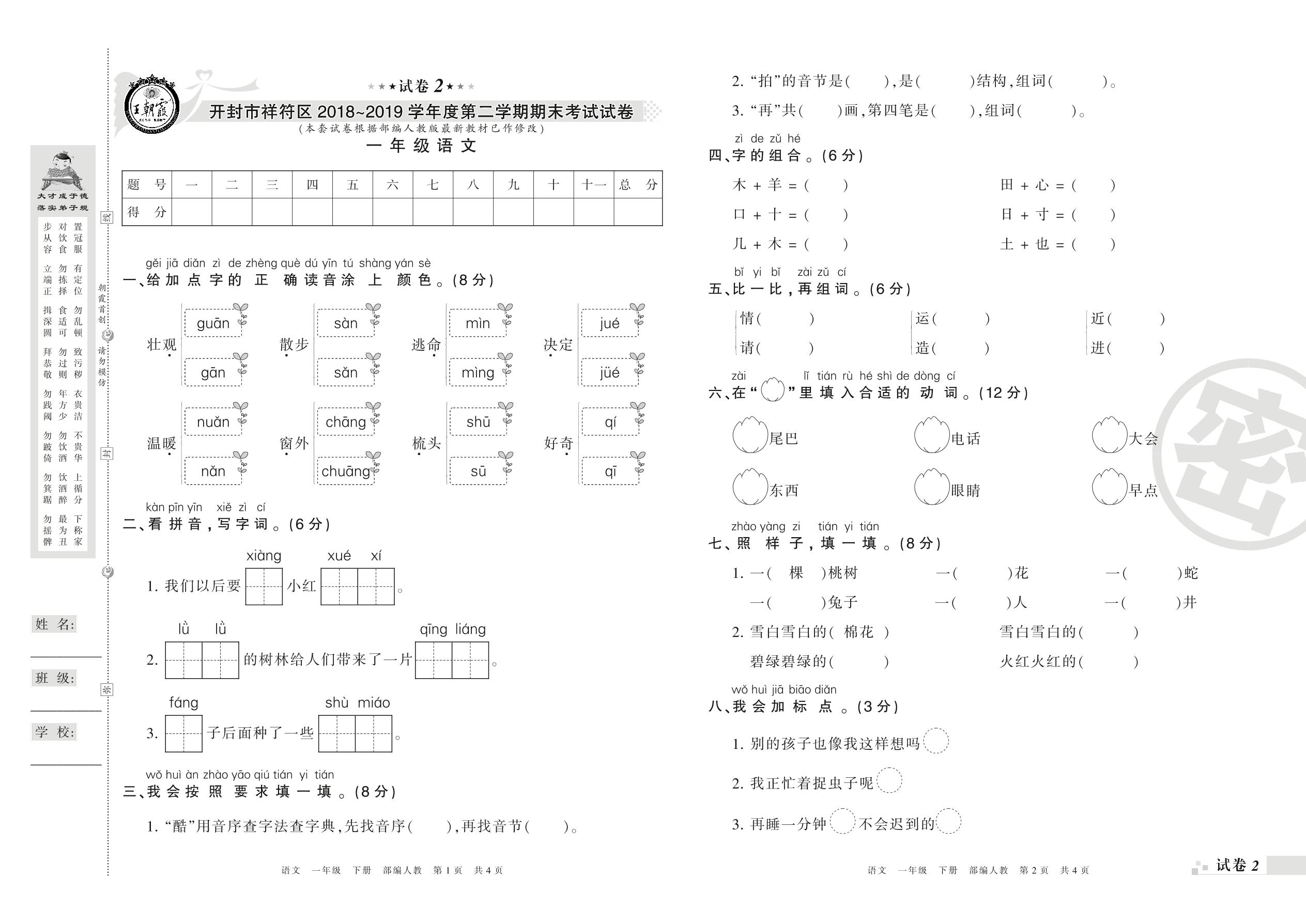 2018-2019学年第二学期开封市祥符区一年级语文试卷(人教版)【2】