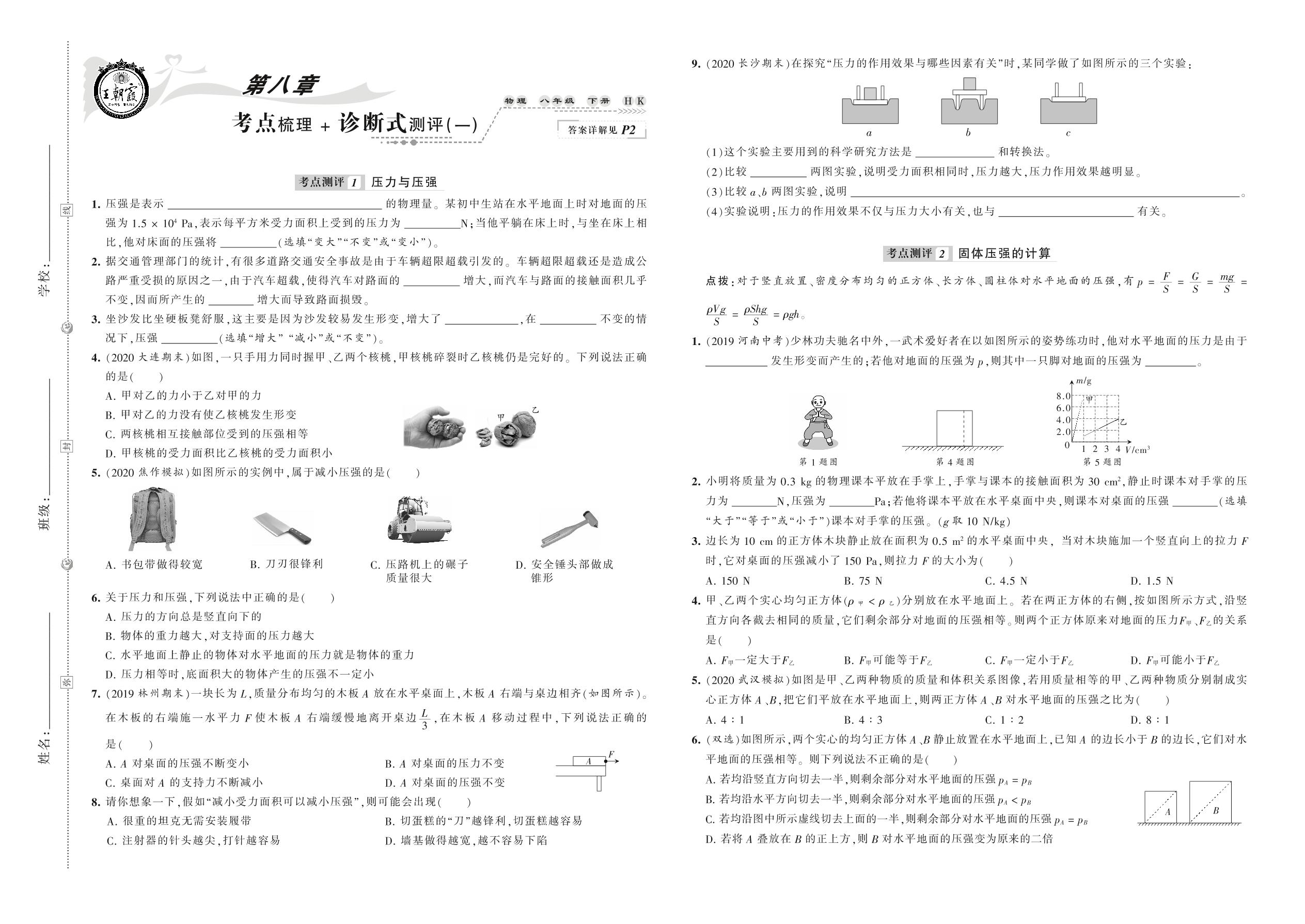 2020-2021学年八年级物理沪科版 第八章 考点梳理 + 诊断式测评(一)