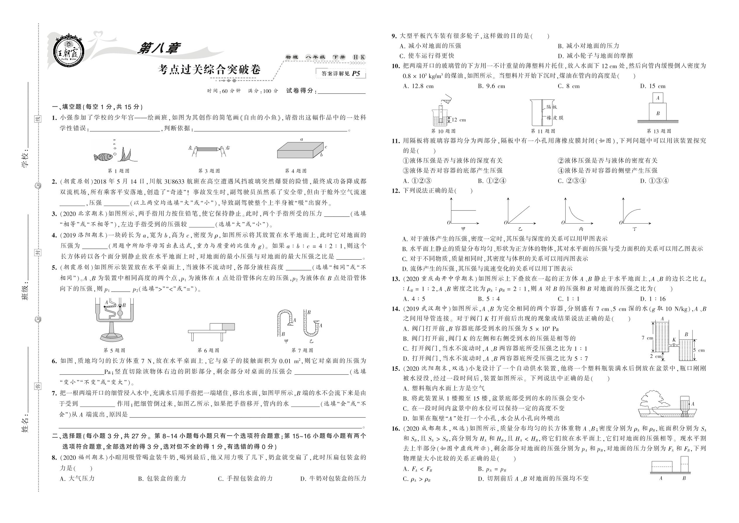 2020-2021学年八年级物理沪科版 第八章 考点过关综合突破卷