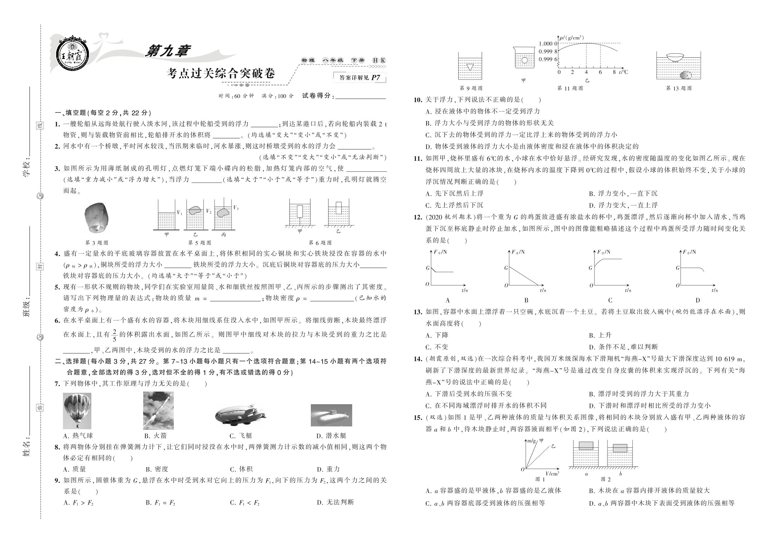 2020-2021学年八年级物理沪科版 第九章 考点过关综合突破卷