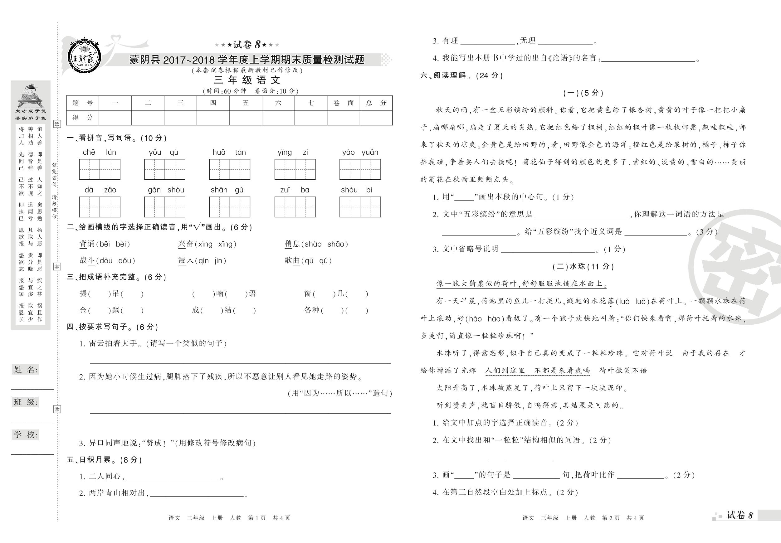 2017-2018学年第一学期临沂市蒙阴县三年级语文试卷(人教版)【8】
