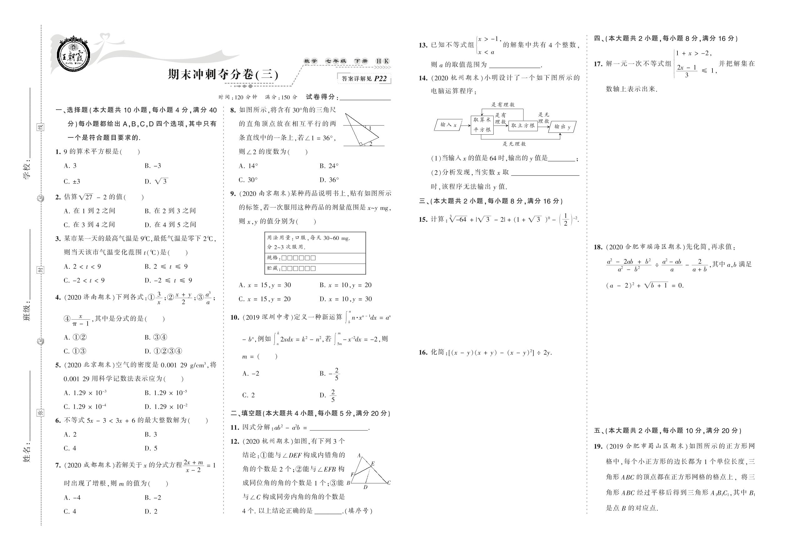 2021下册七年级数学沪科版 期末冲刺夺分卷(三)