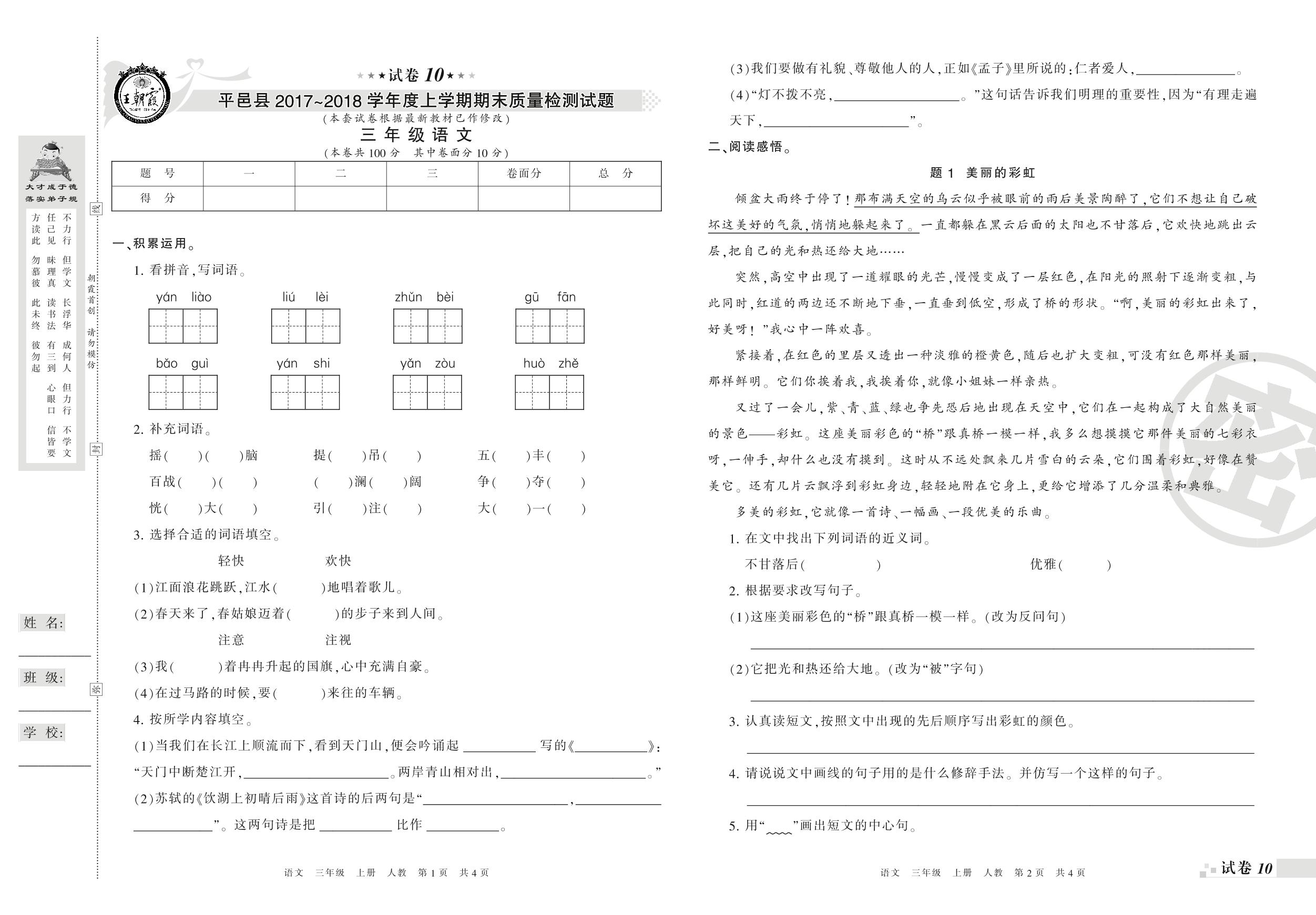 2017-2018学年第一学期临沂市平邑县三年级语文试卷(人教版)【10】