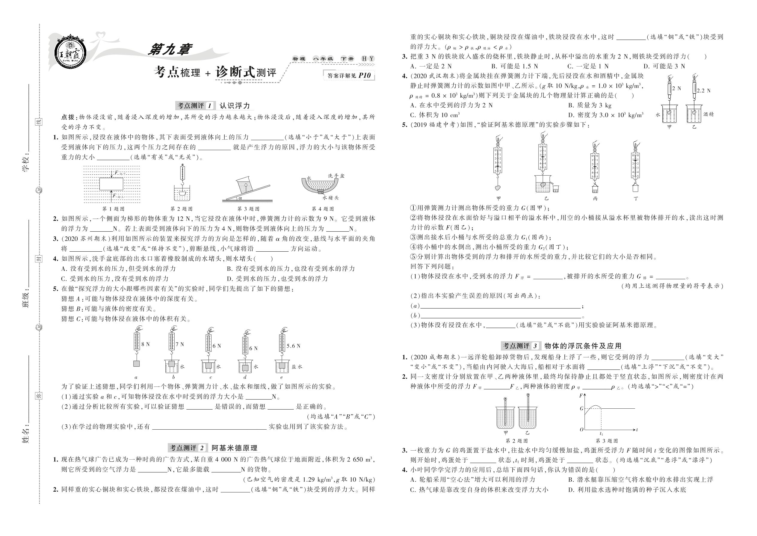 2021下册八年级物理沪粤版 第九章 考点梳理 + 诊断式测评