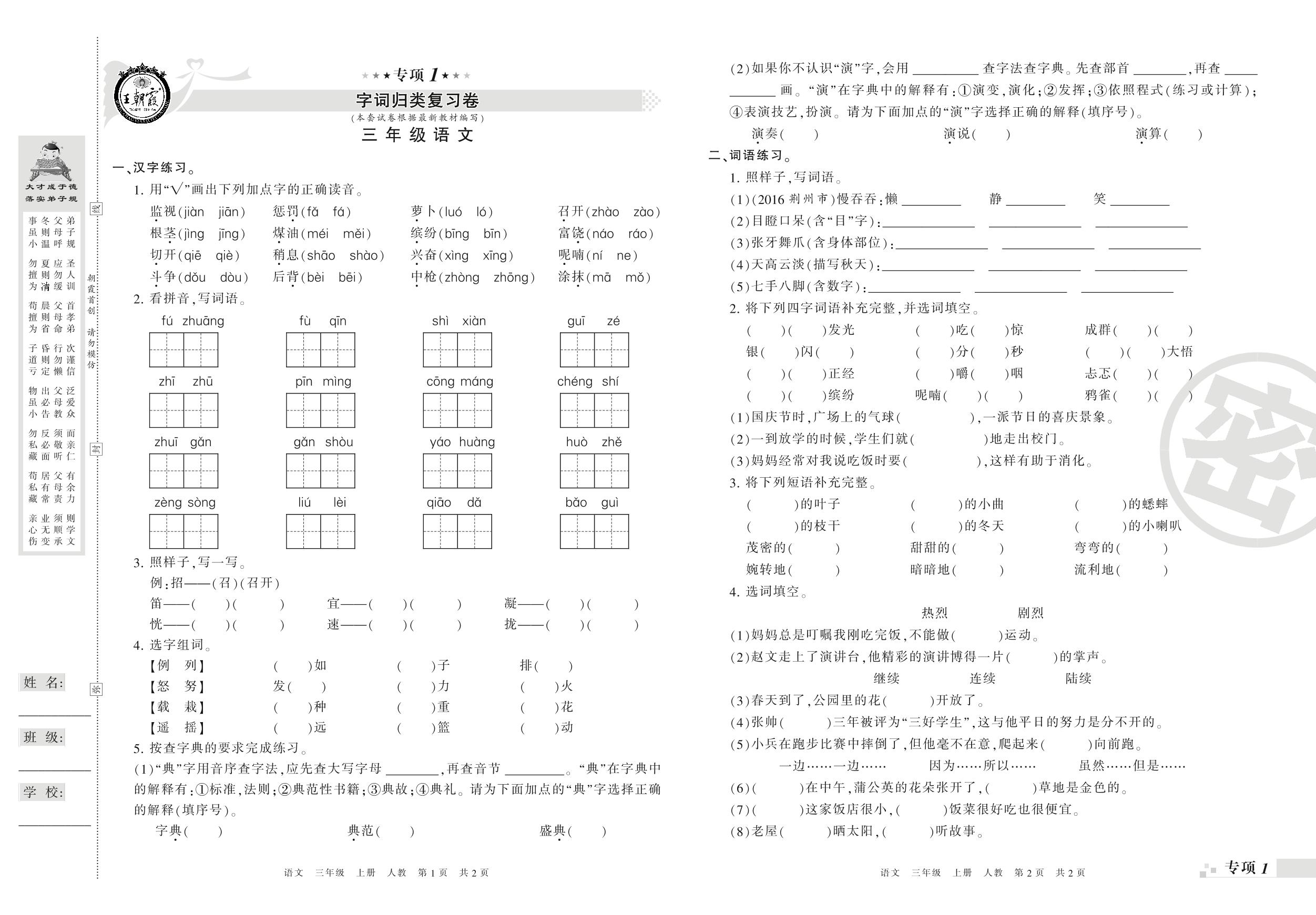 王朝霞期末专项卷——字词、句子真题归类复习三年级上册语文(人教版)【0】