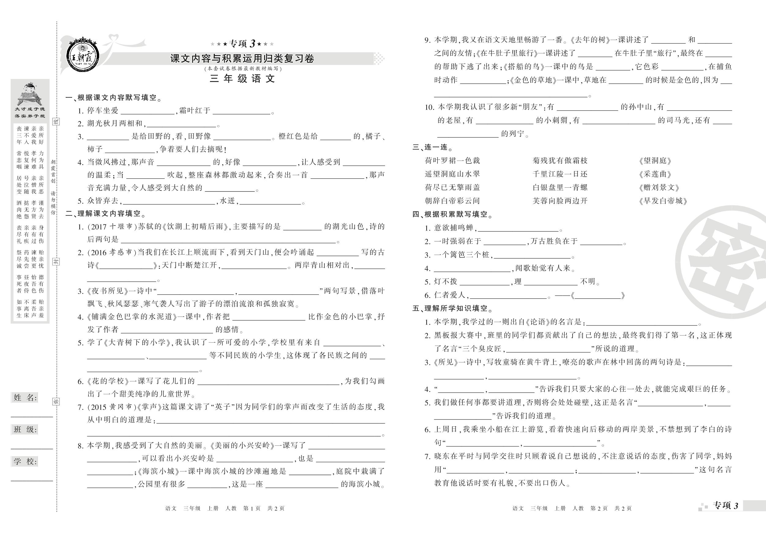 王朝霞期末专项卷——课文内容与积累运用、课内阅读与写作真题归类复习三年级上册语文(人教版)【0】