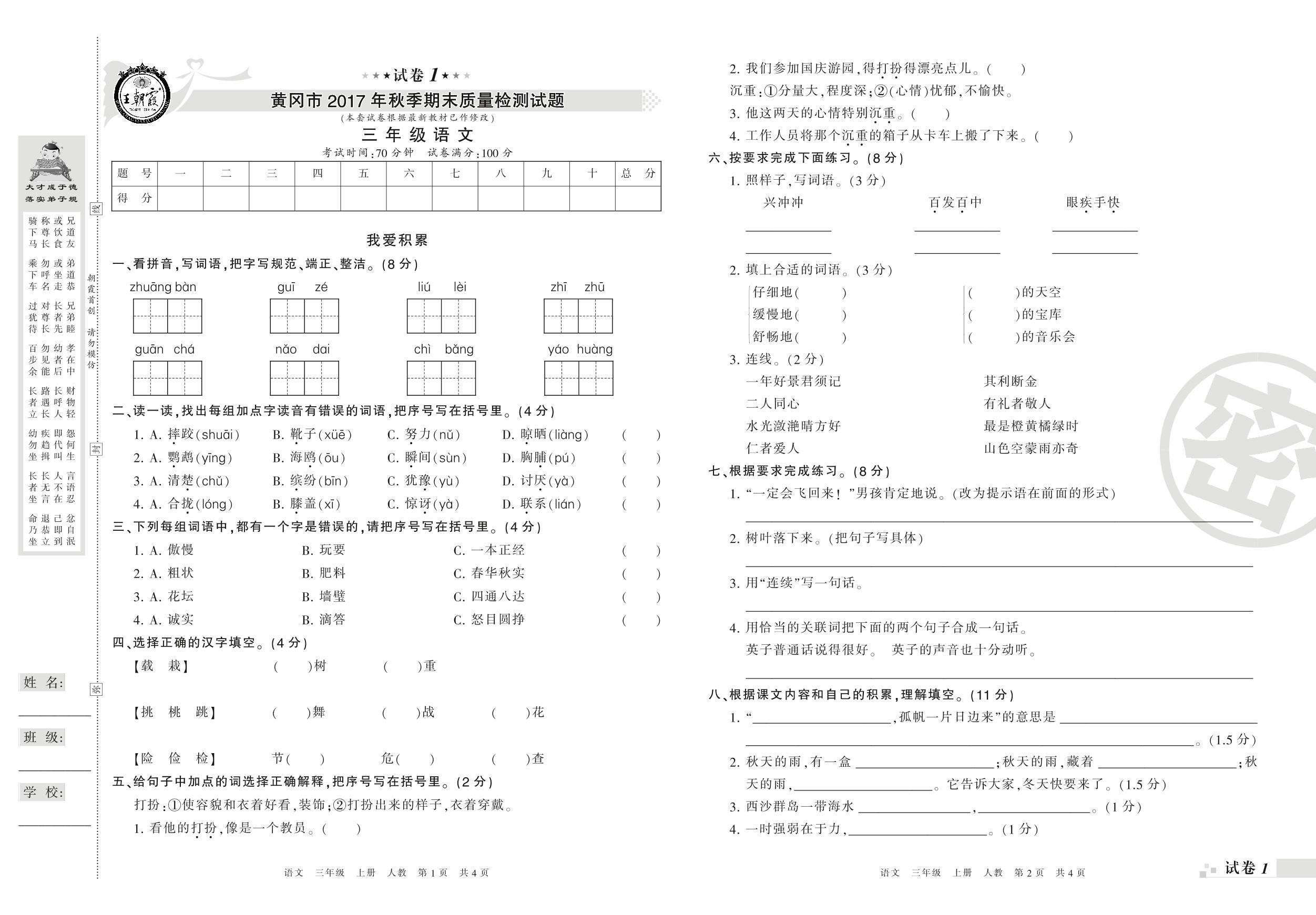 2017-2018学年第一学期黄冈市三年级语文试卷(人教版)【1】