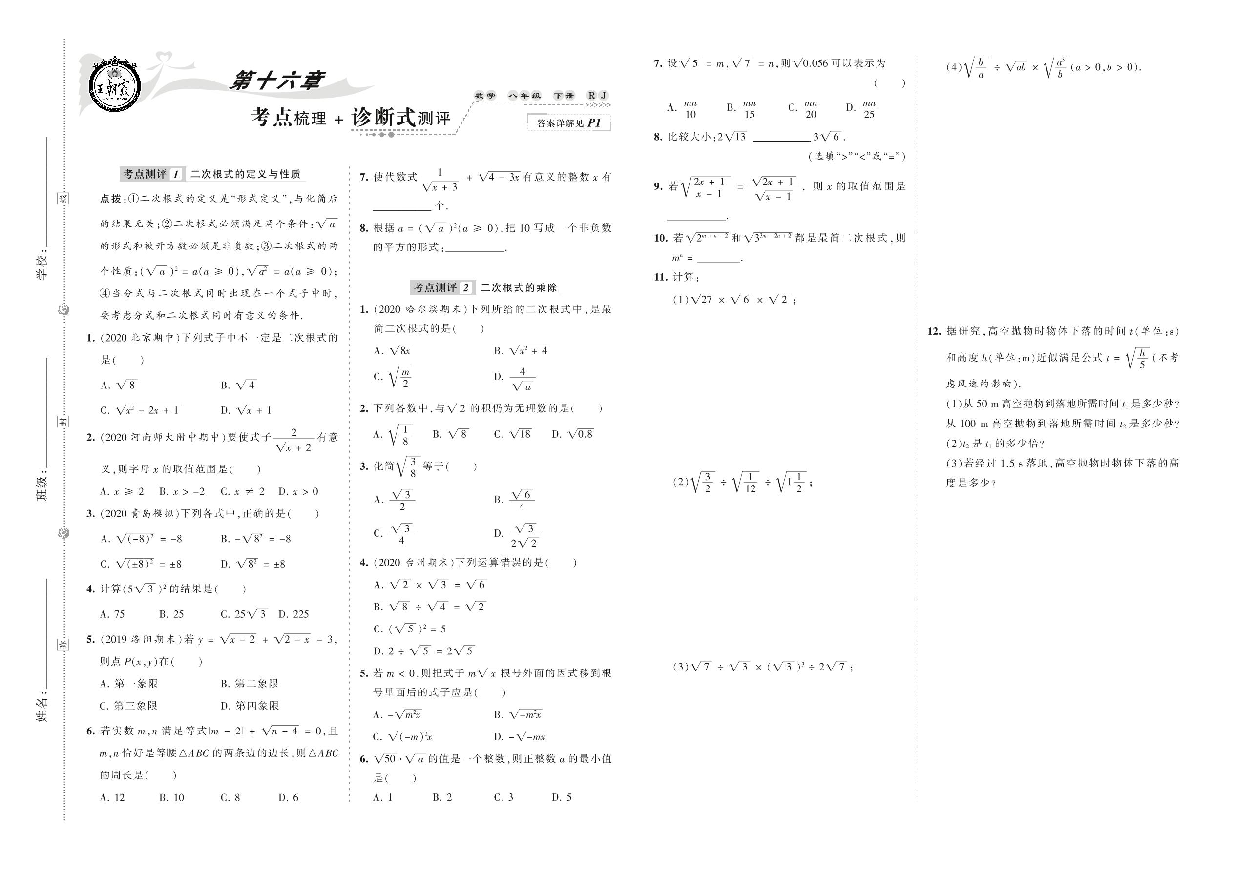 2021下册八年级数学人教版 第十六章 考点梳理 + 诊断式测评