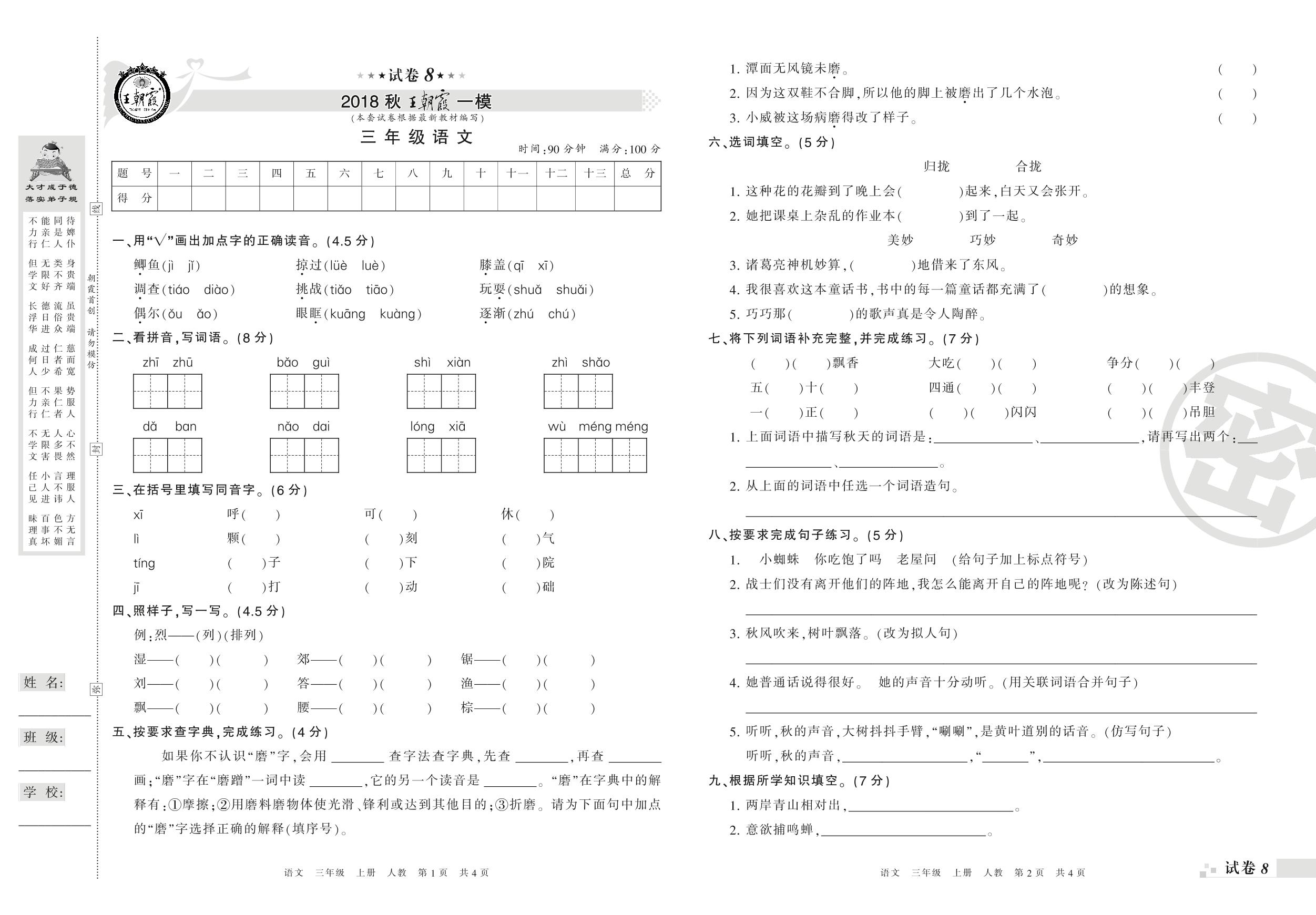 王朝霞期末模拟卷三年级上册语文(人教版)_R210801102807【8】
